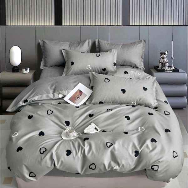 Lenjerie pat dublu, FINET, 6 piese, cu ELASTIC, Gri, inimioare, Johny Home Pucioasa, cod produs: SPR-T-255