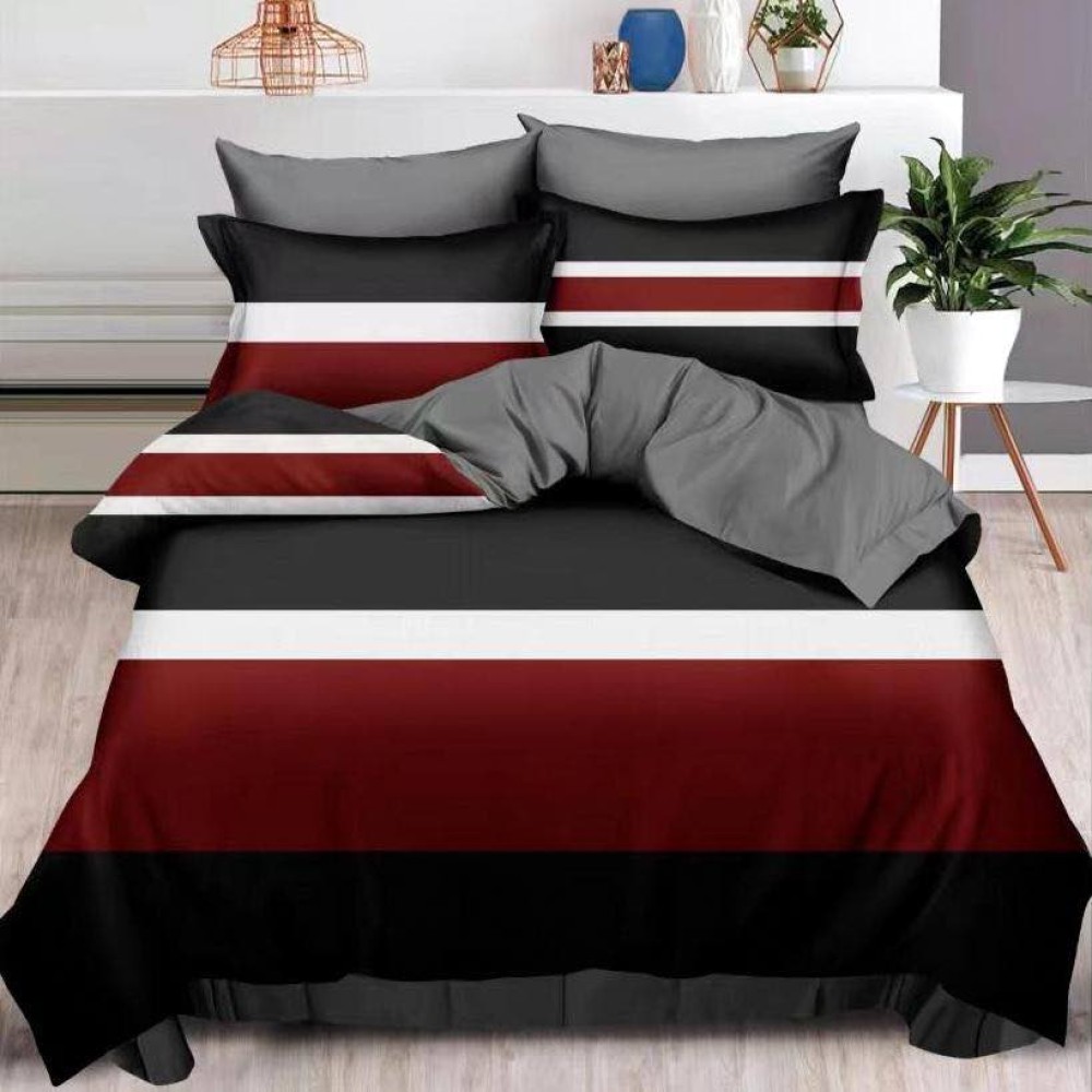 Lenjerie pat dublu, FINET, 6 piese, cu ELASTIC, Rosu-Negru, dungi, Johny Home Pucioasa, cod produs: SPR-T-40