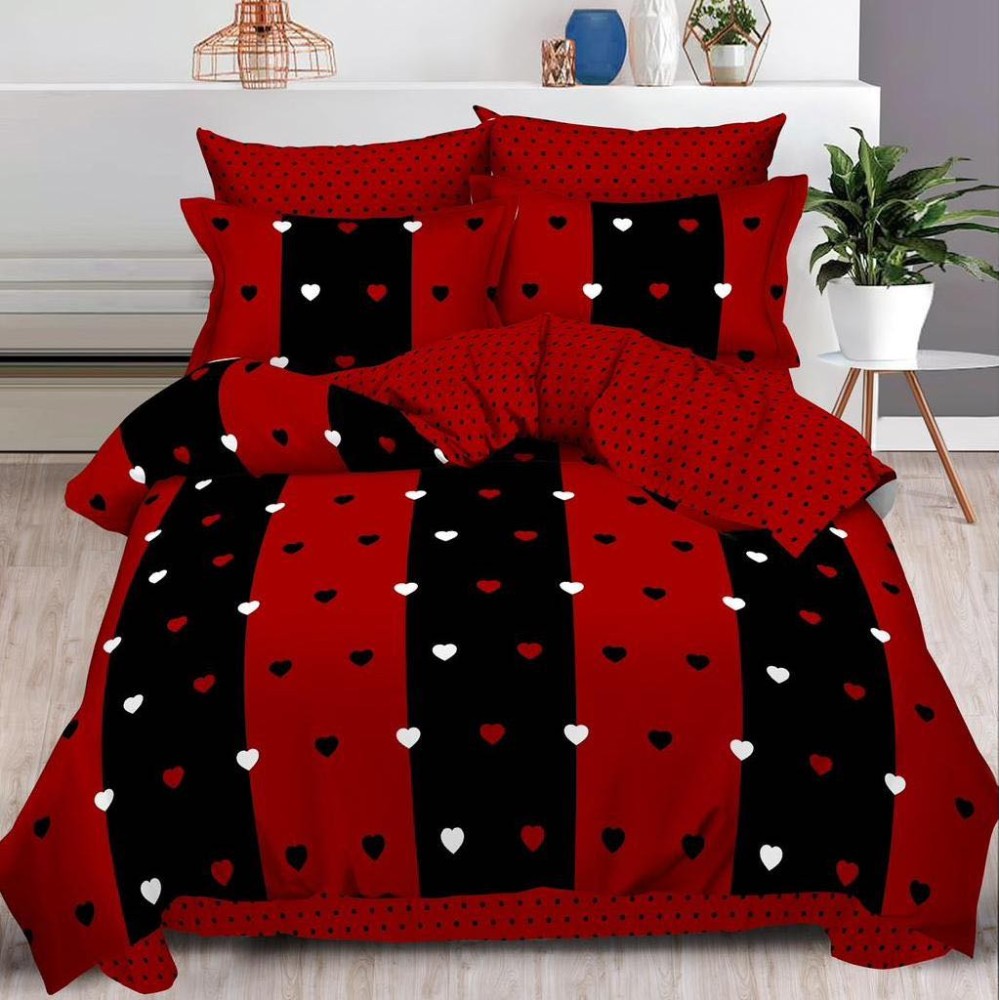 Lenjerie pat dublu, FINET, 6 piese, cu ELASTIC, Rosu-Negru, inimioare, Johny Home Pucioasa, cod produs: SPR-T-55
