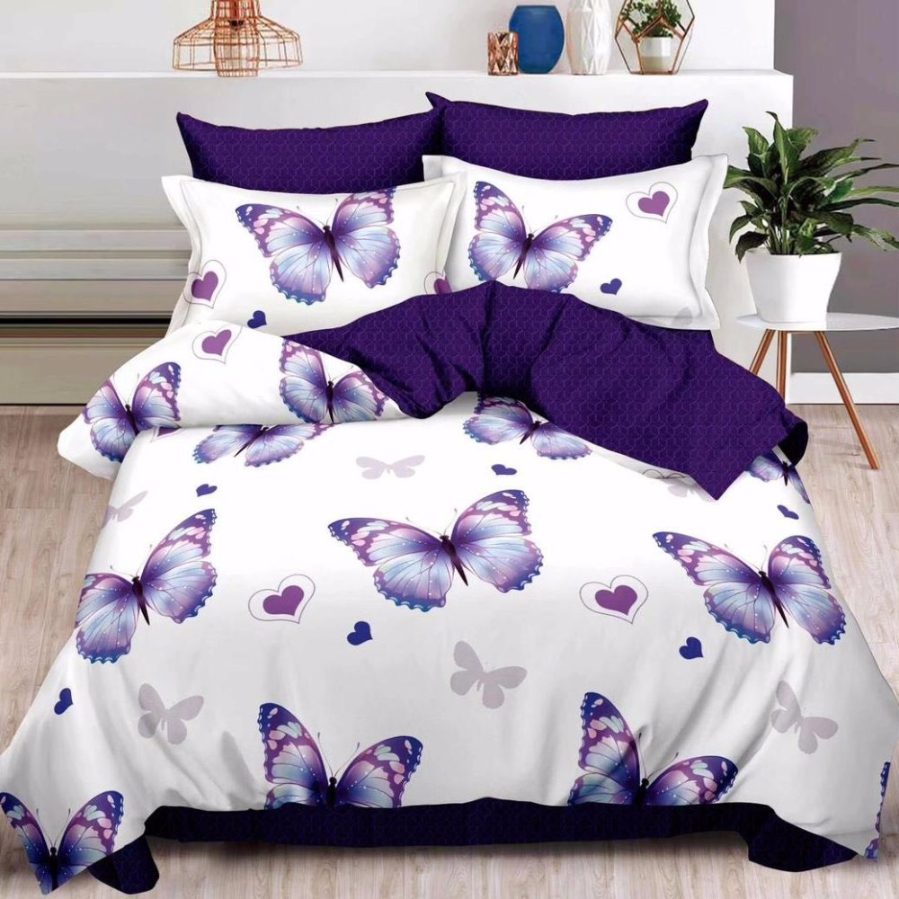 Lenjerie pat dublu, FINET, 6 piese, cu ELASTIC, Mov, fluturi, inimioare, Johny Home Pucioasa, cod produs: SPR-T-87