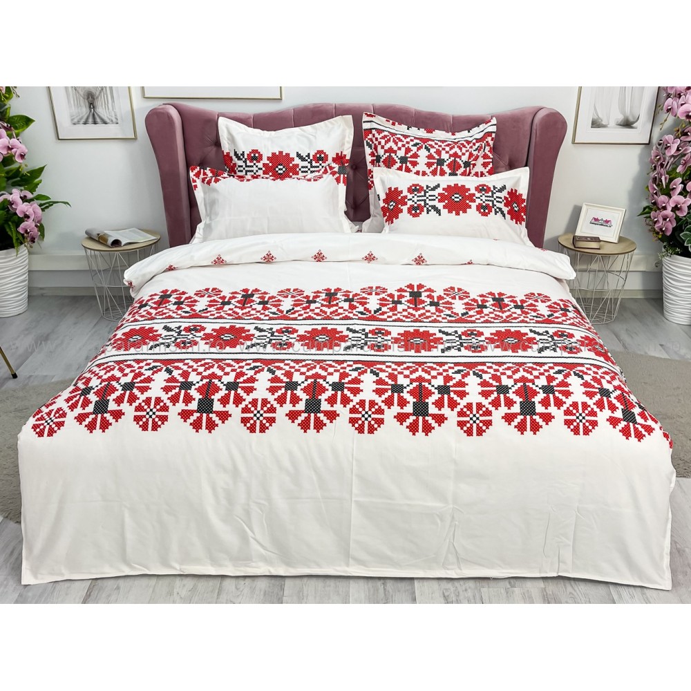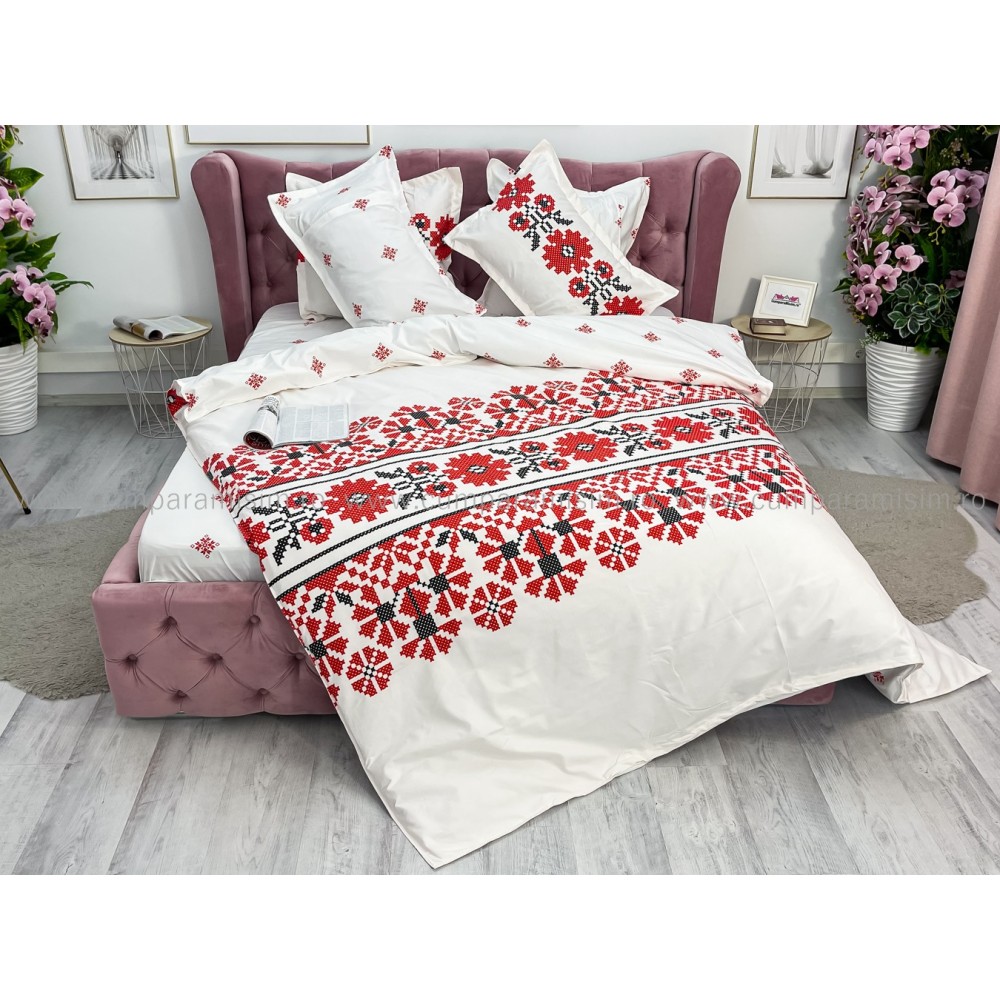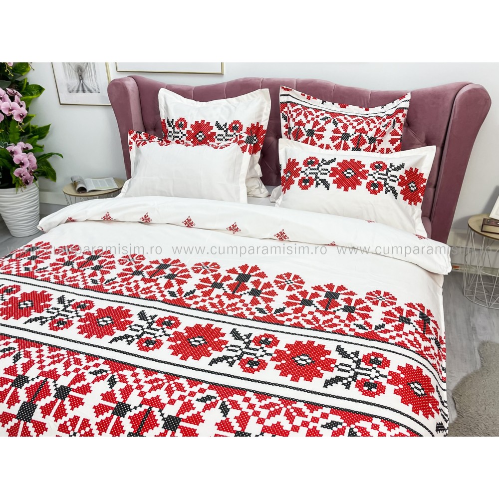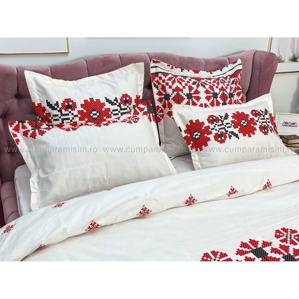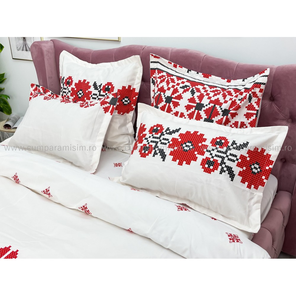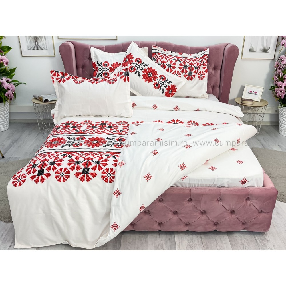 Lenjerie pat dublu, FINET, 6 piese, cu ELASTIC, Alb-Rosu, model traditional, Johny Home Pucioasa, cod produs: SPR-T-197