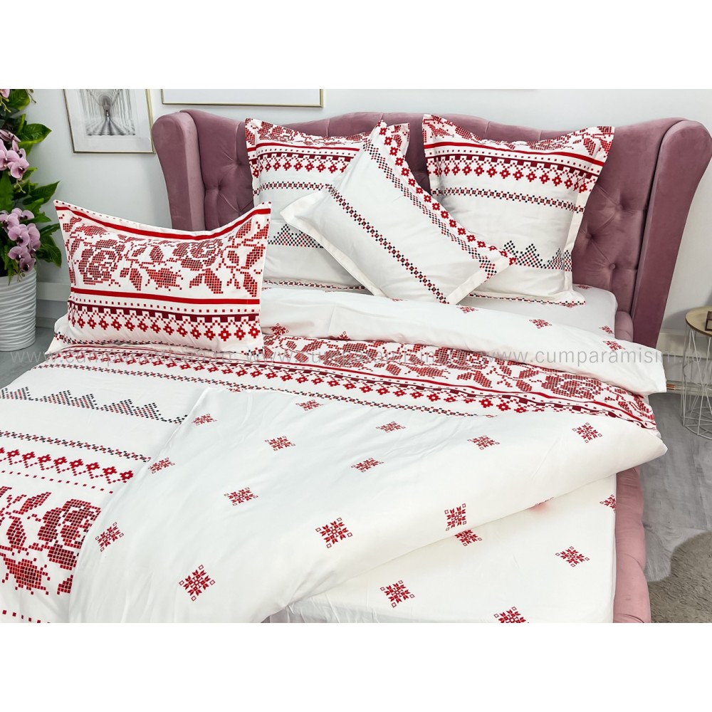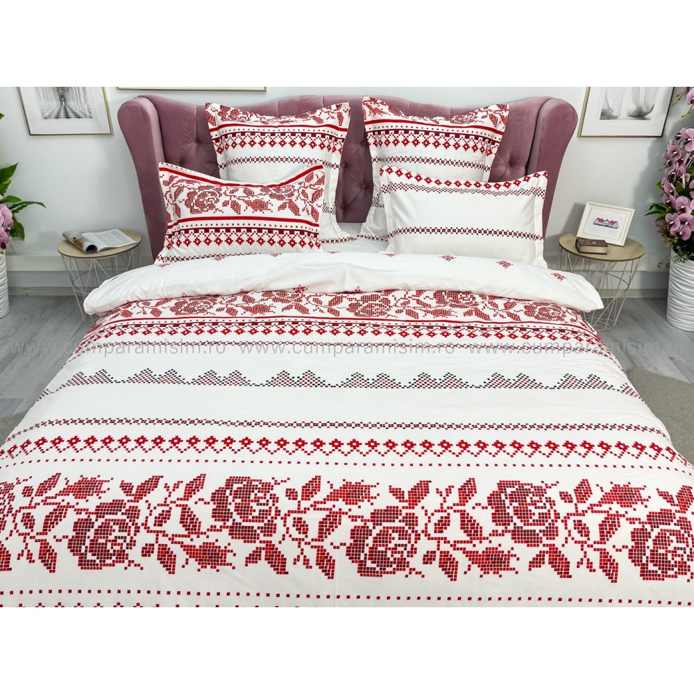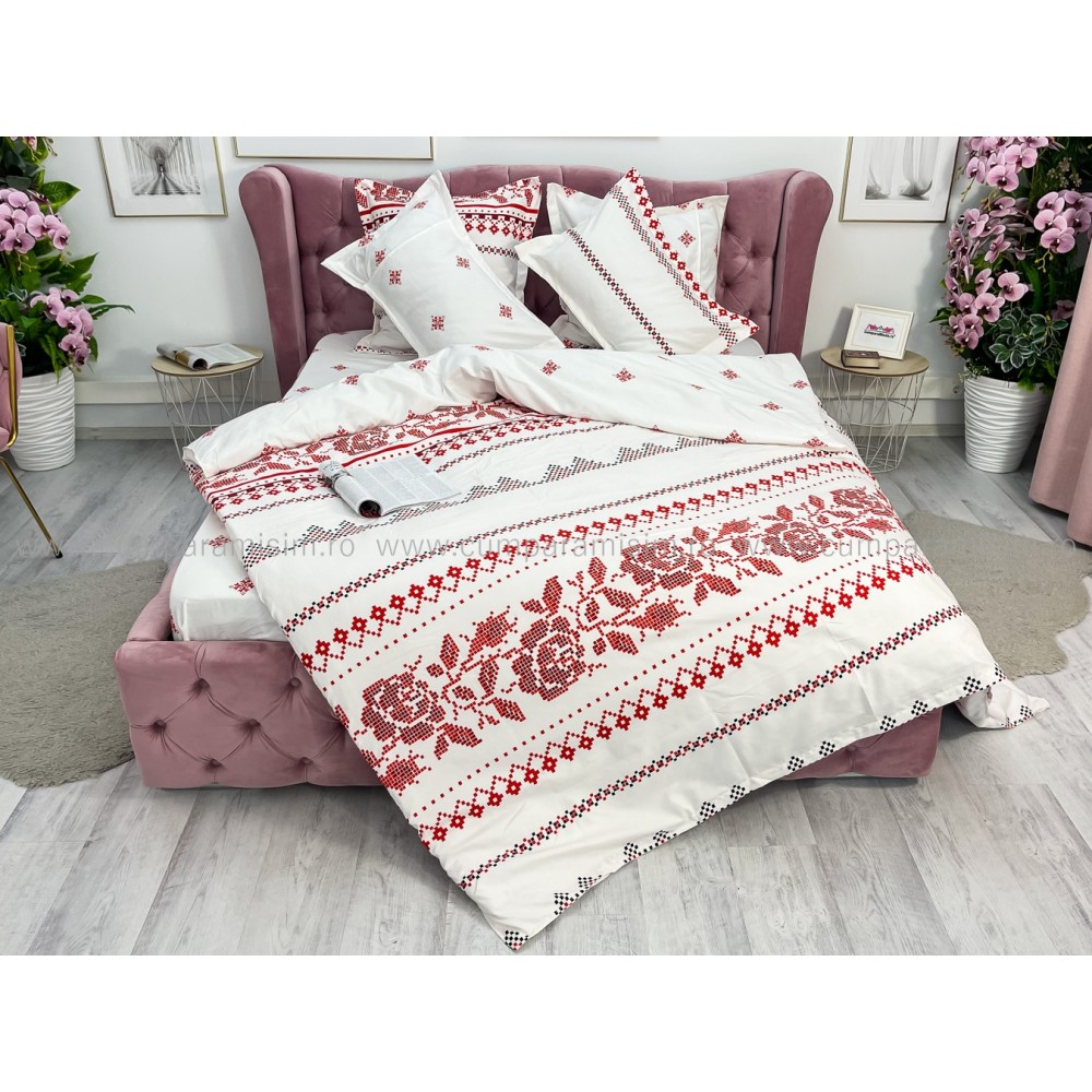 Lenjerie pat dublu, FINET, 6 piese, cu ELASTIC, Alb-Rosu, model traditional, Johny Home Pucioasa, cod produs: SPR-T-199