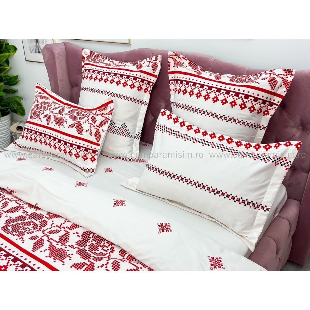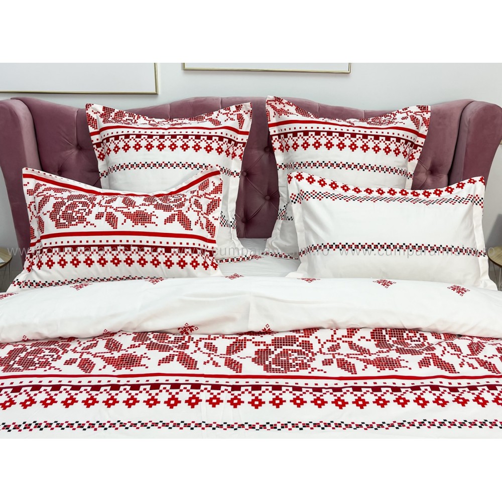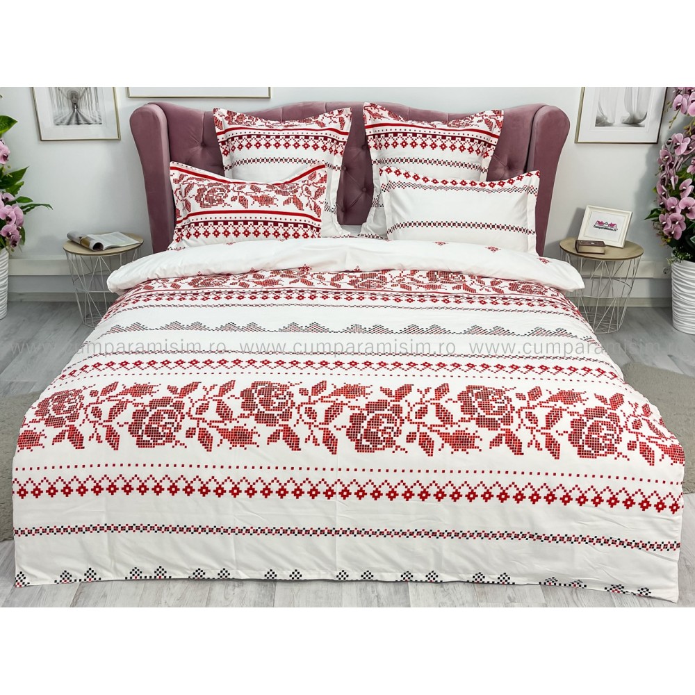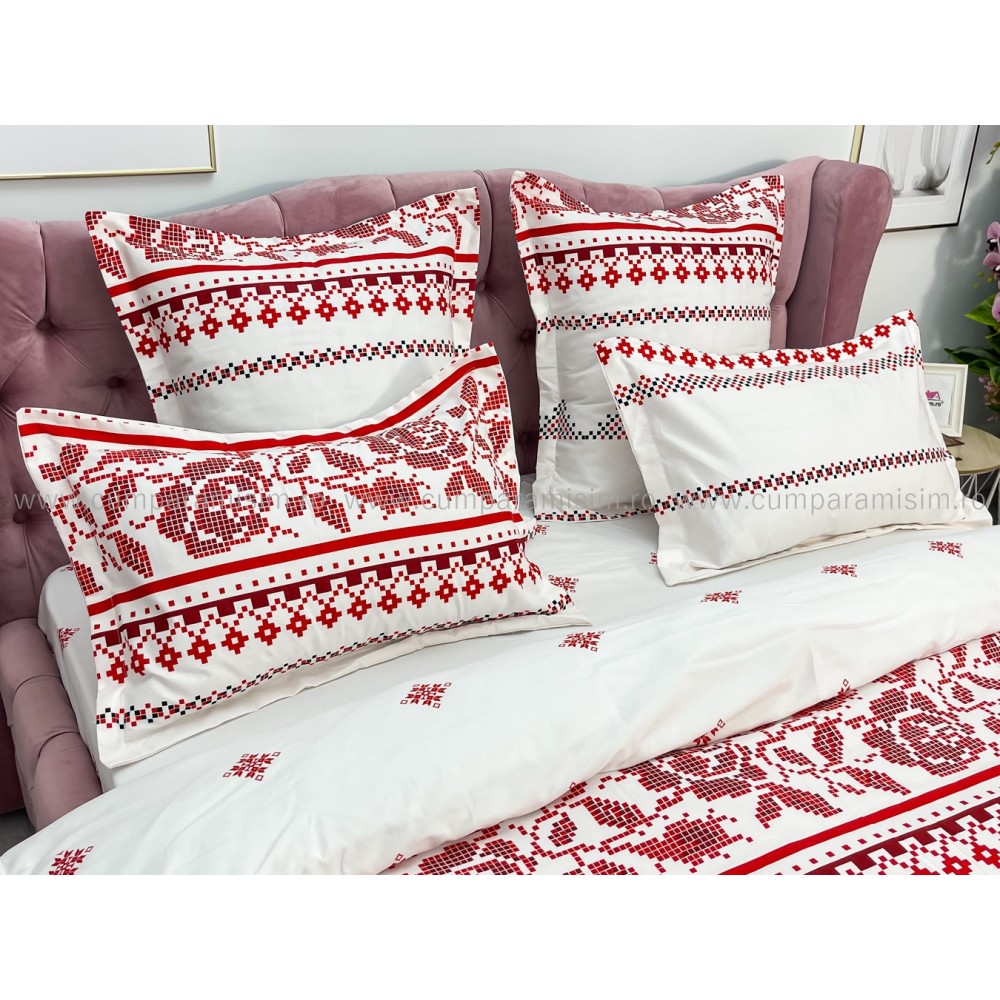 Lenjerie pat dublu, FINET, 6 piese, cu ELASTIC, Alb-Rosu, model traditional, Johny Home Pucioasa, cod produs: SPR-T-199