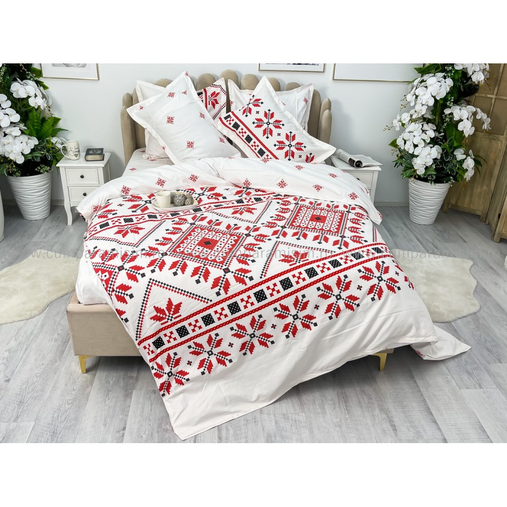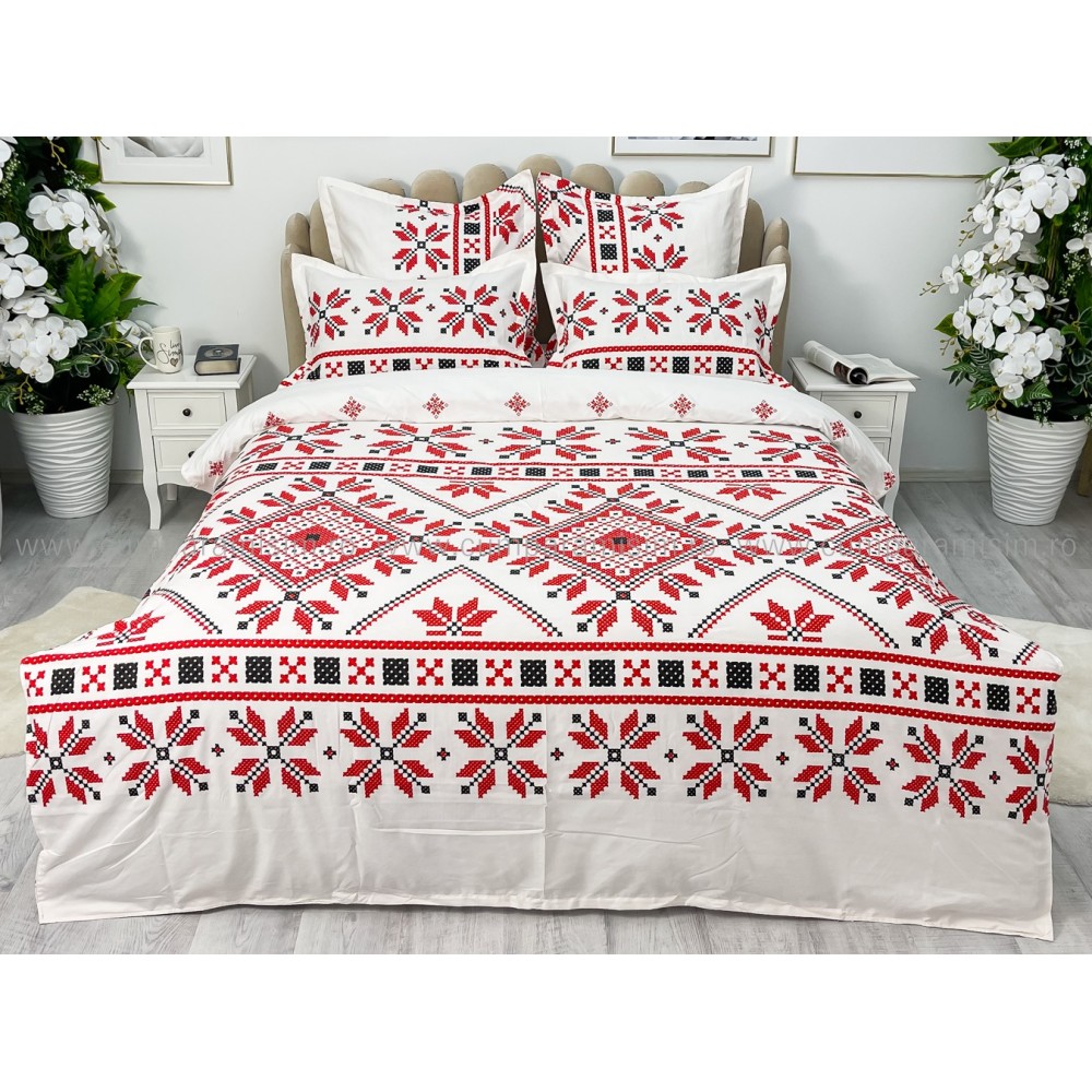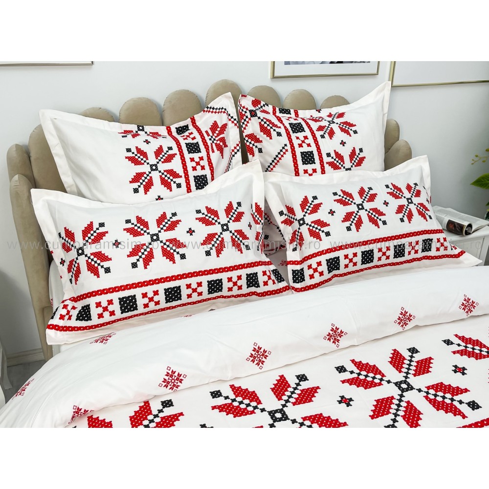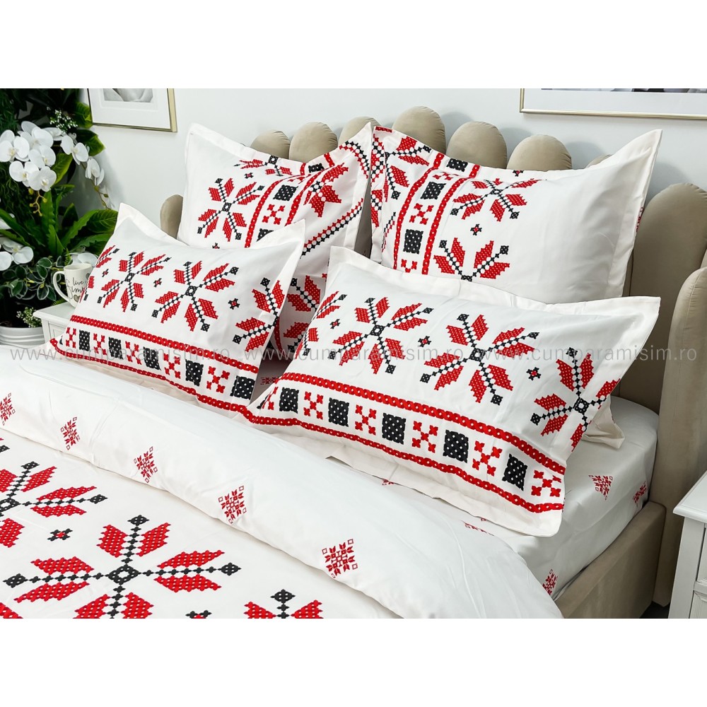 Lenjerie pat dublu, FINET, 6 piese, cu ELASTIC, Alb-Rosu, model traditional, Johny Home Pucioasa, cod produs: SPR-T-200