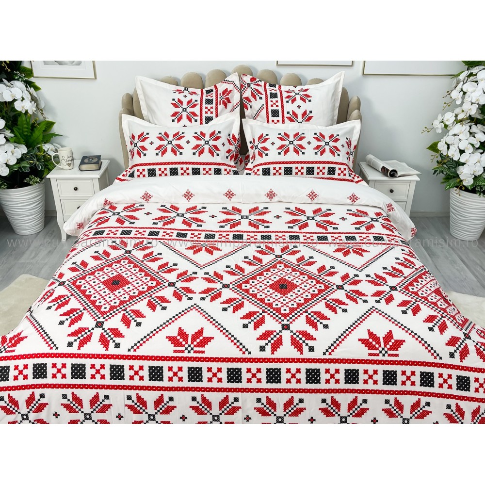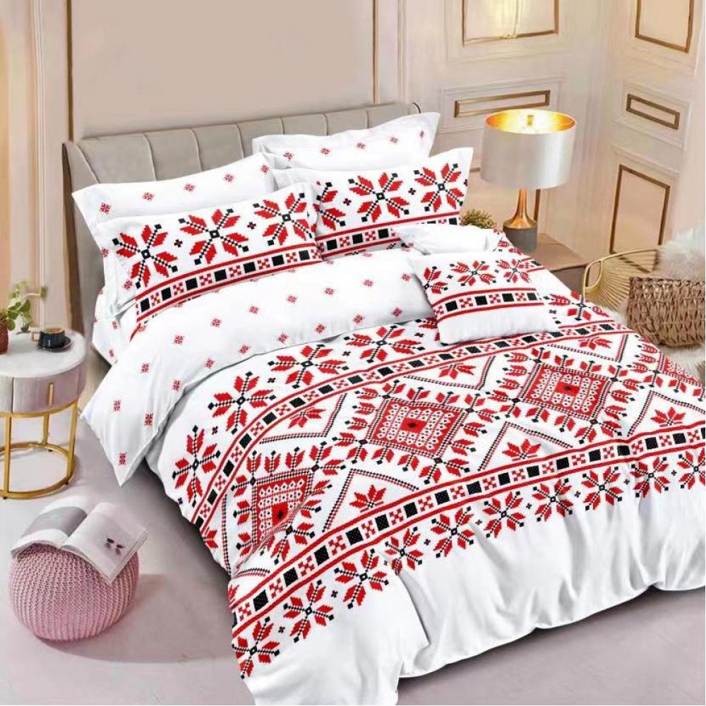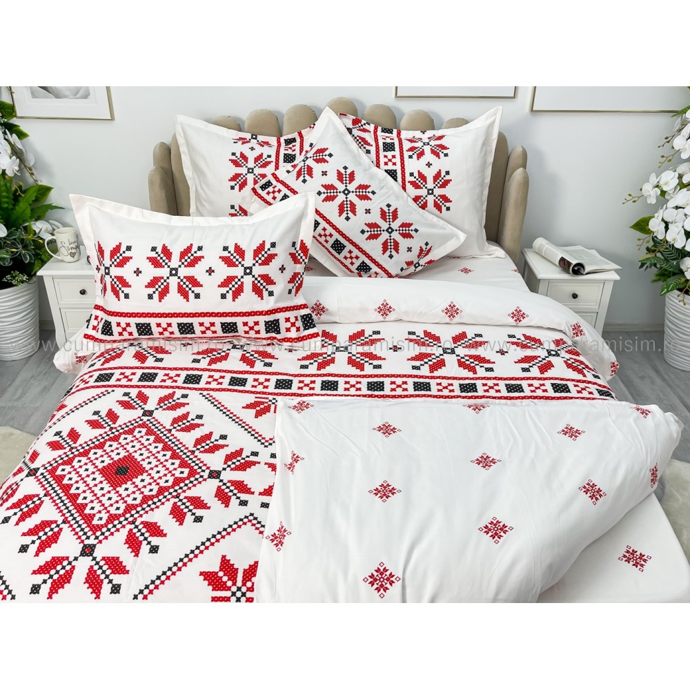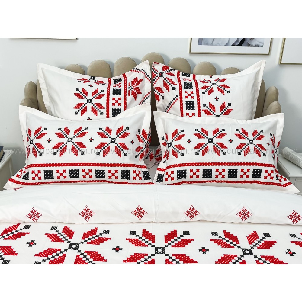 Lenjerie pat dublu, FINET, 6 piese, cu ELASTIC, Alb-Rosu, model traditional, Johny Home Pucioasa, cod produs: SPR-T-200