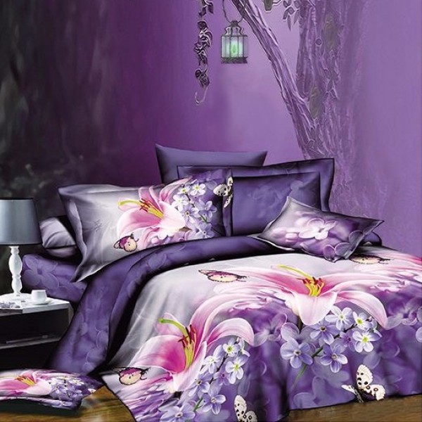 Lenjerie pat dublu, 4 piese, IMPRIMEU 3D Multiplicat Multiplicat, Microfibra, Mov, fluturi, flori, Johny Home Pucioasa, cod produs: SPR-B-191