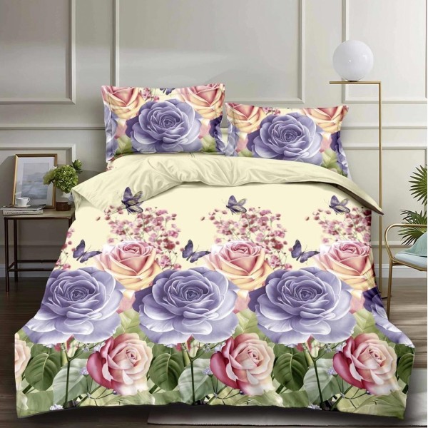 Lenjerie pat dublu, 4 piese, IMPRIMEU 3D Multiplicat, Microfibra, Lila, trandafiri, Johny Home Pucioasa, cod produs: SPR-B-345