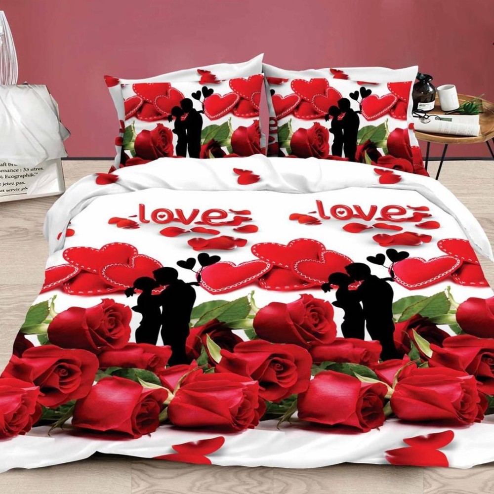 Lenjerie pat dublu, 4 piese, IMPRIMEU 3D Multiplicat Multiplicat, Microfibra, Rosu, indragostiti, trandafiri, Johny Home Pucioasa, cod produs: SPR-B-447