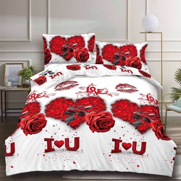 Lenjerie pat dublu, 4 piese, IMPRIMEU 3D Multiplicat Multiplicat, Microfibra, Rosu, trandafiri, inimioare, Johny Home Pucioasa, cod produs: SPR-B-456