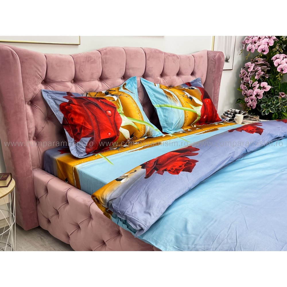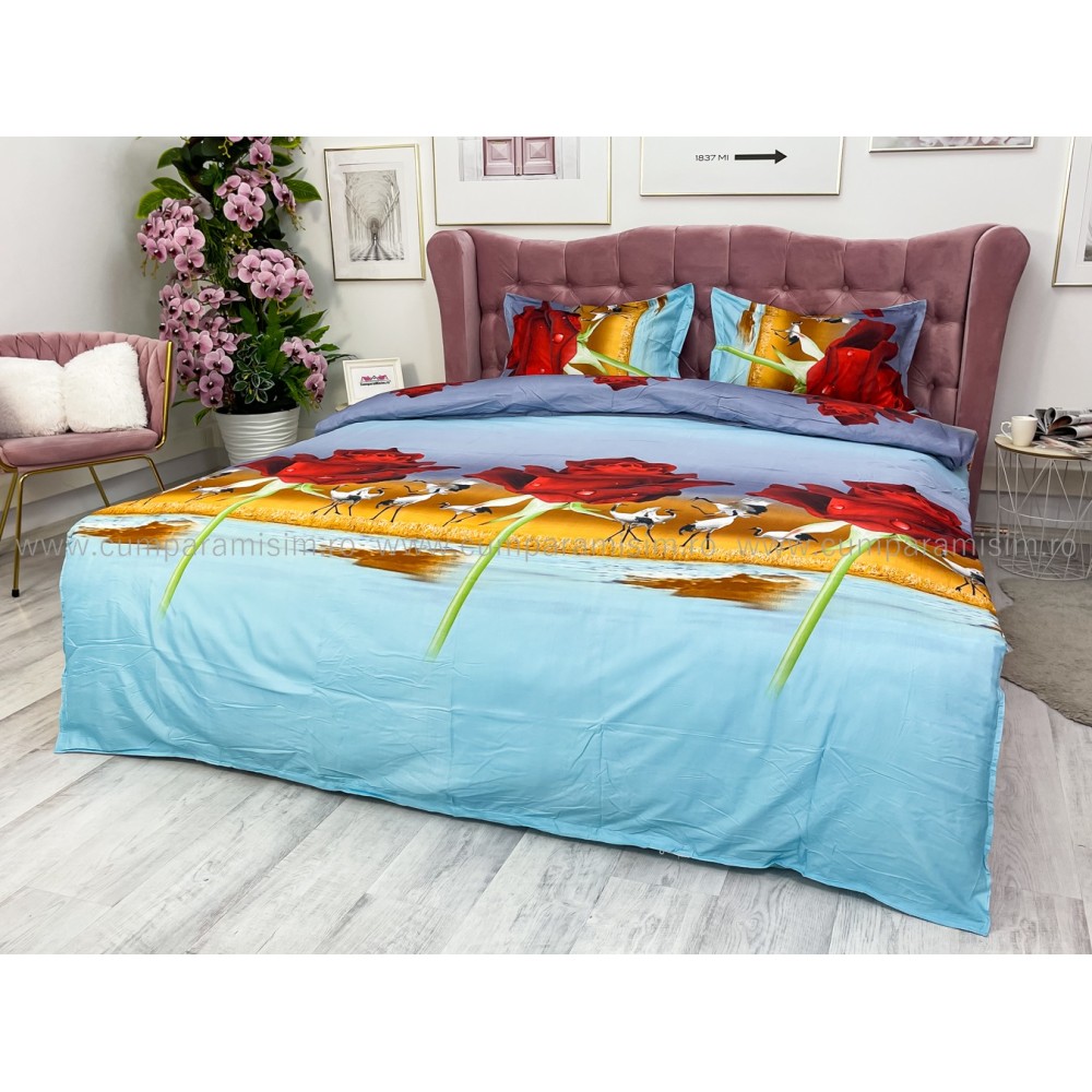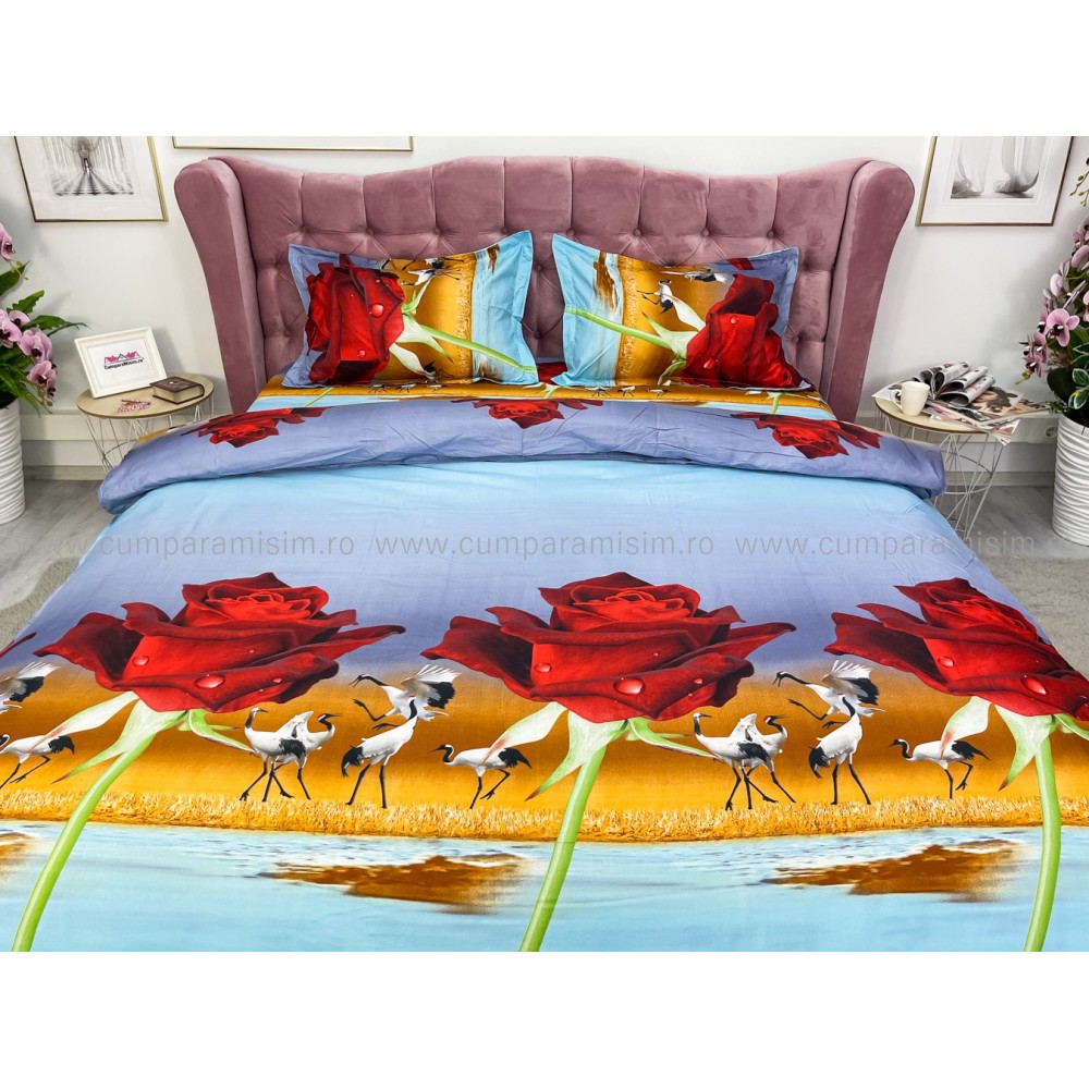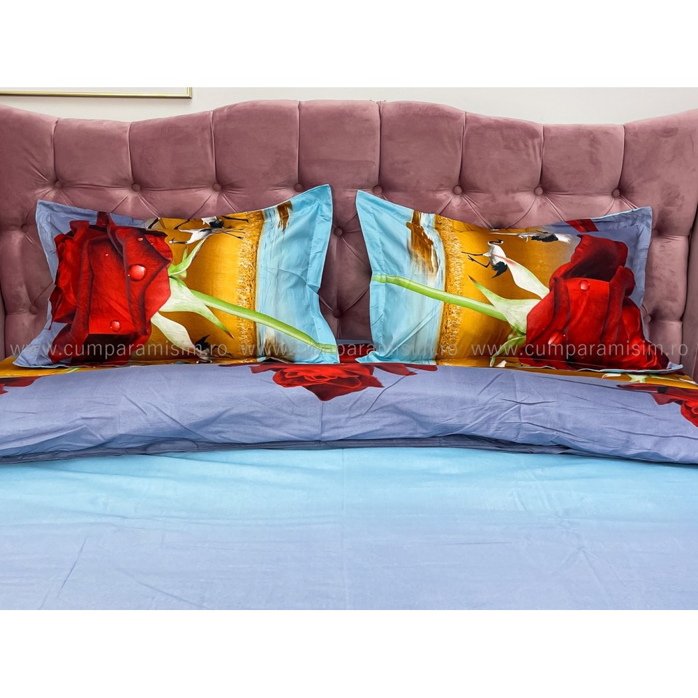 Lenjerie pat dublu, 4 piese, IMPRIMEU 3D Multiplicat, Microfibra, Rosu, trandafiri, Johny Home Pucioasa, cod produs: SPR-B-481