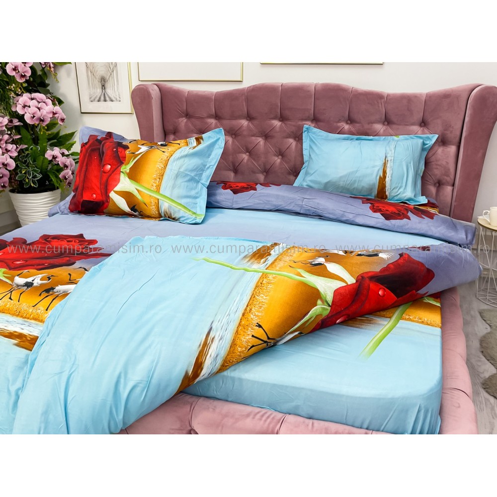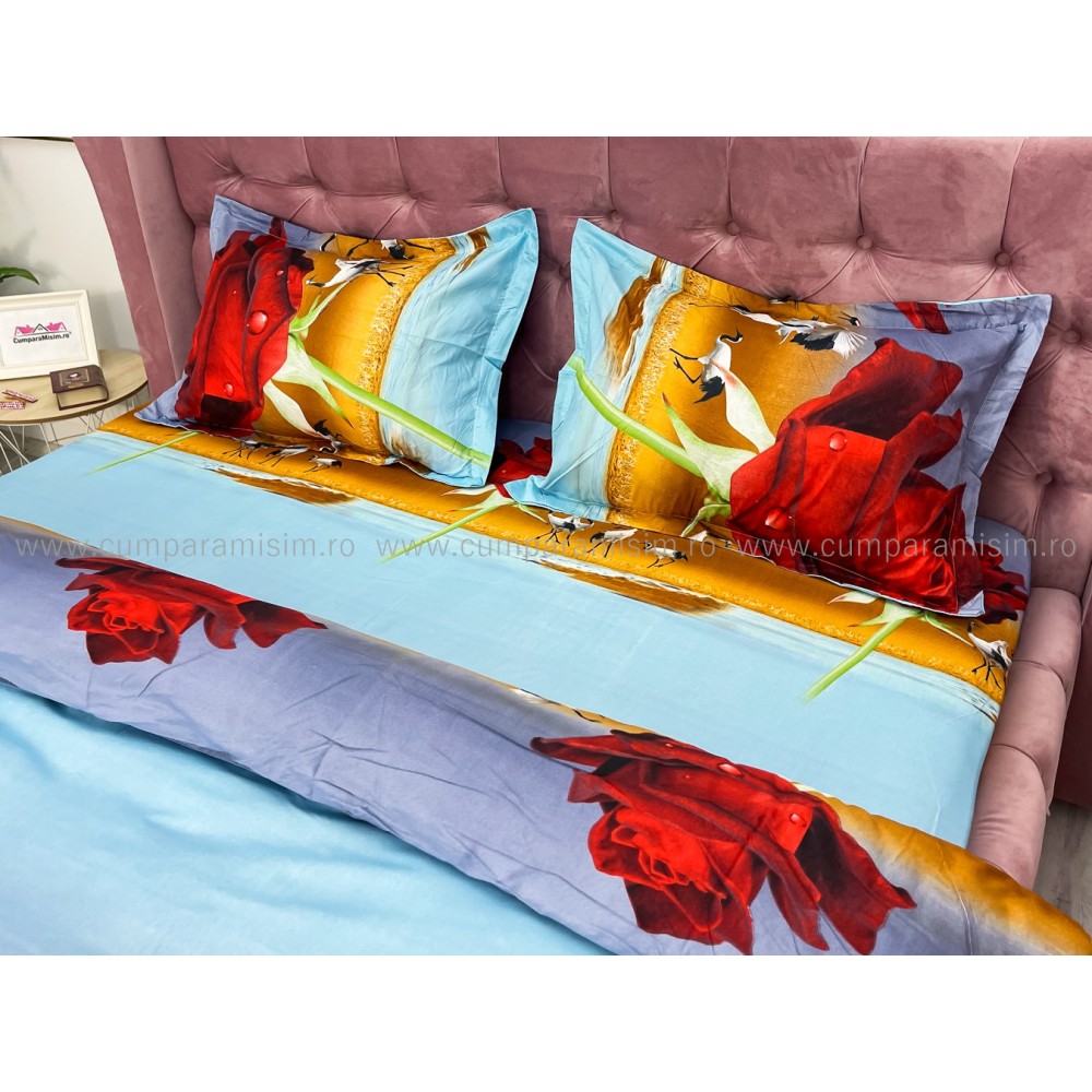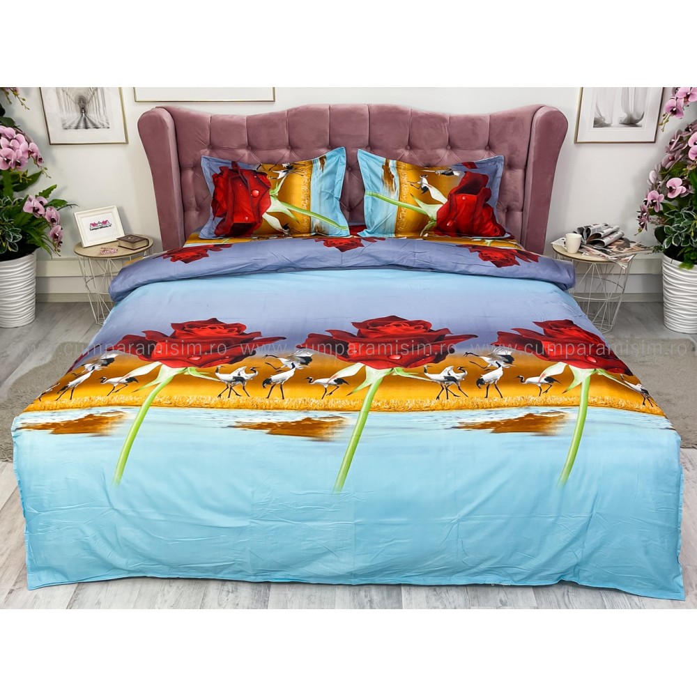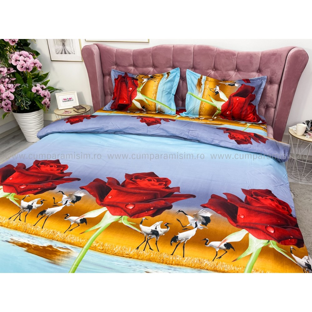 Lenjerie pat dublu, 4 piese, IMPRIMEU 3D Multiplicat, Microfibra, Rosu, trandafiri, Johny Home Pucioasa, cod produs: SPR-B-481