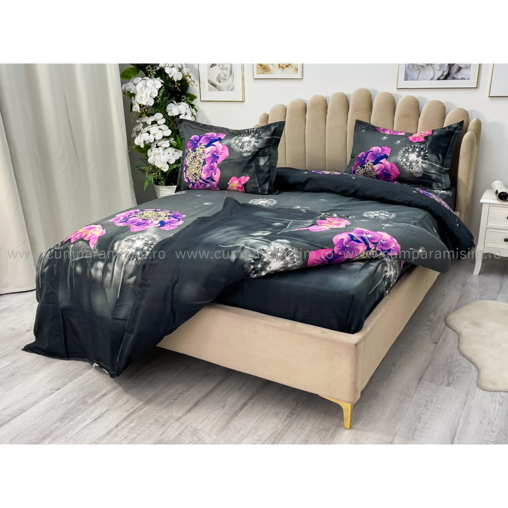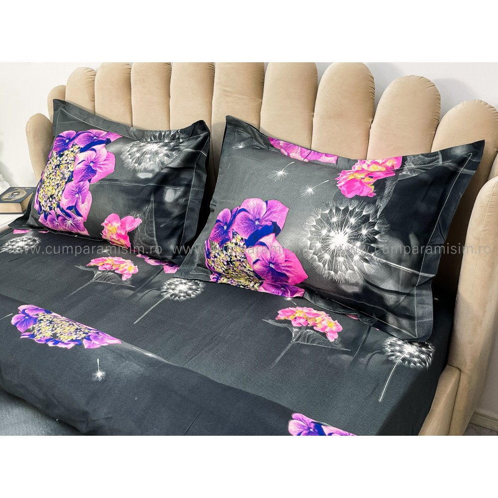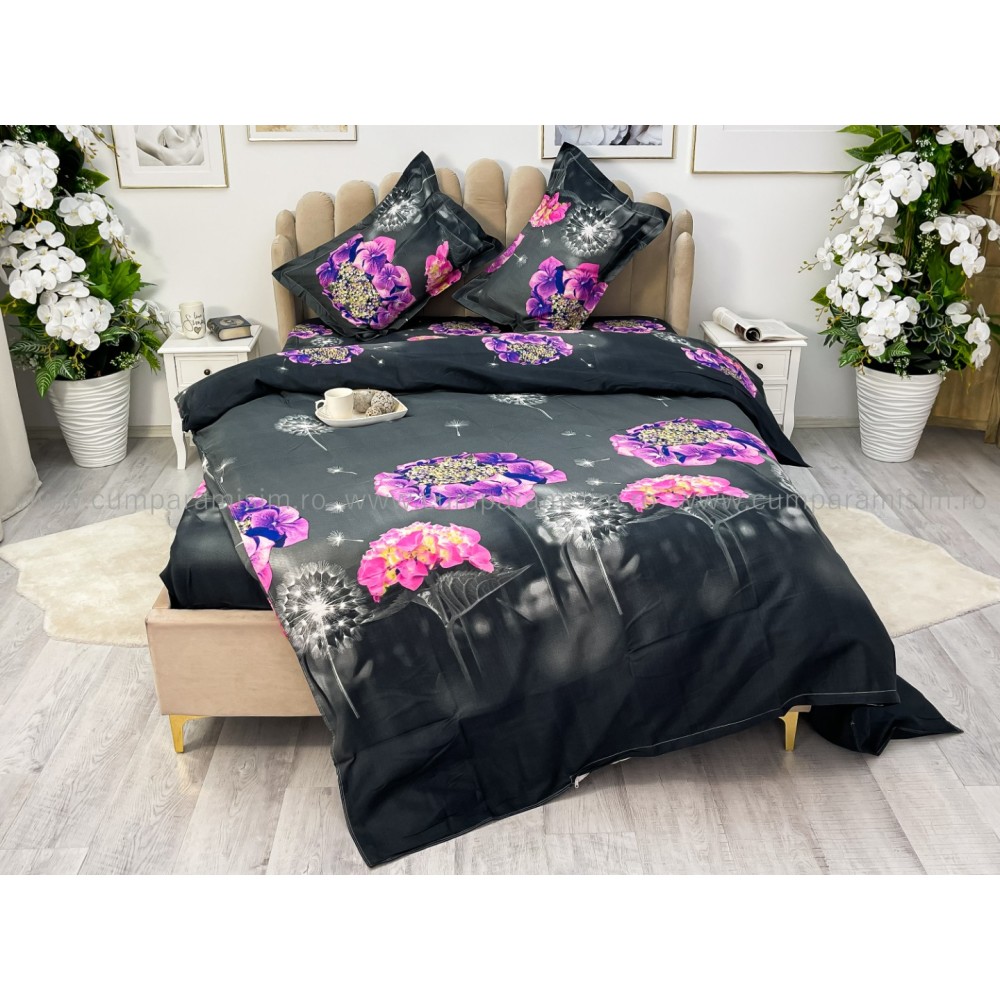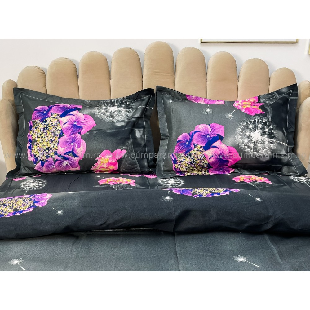 Lenjerie pat dublu, 4 piese, IMPRIMEU 3D Multiplicat, Microfibra, Mov, hortensii, Johny Home Pucioasa, cod produs: SPR-B-489