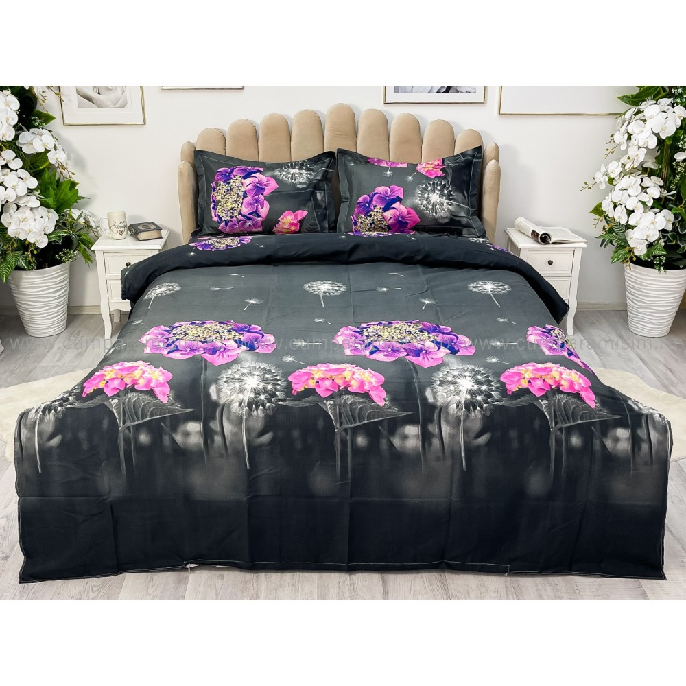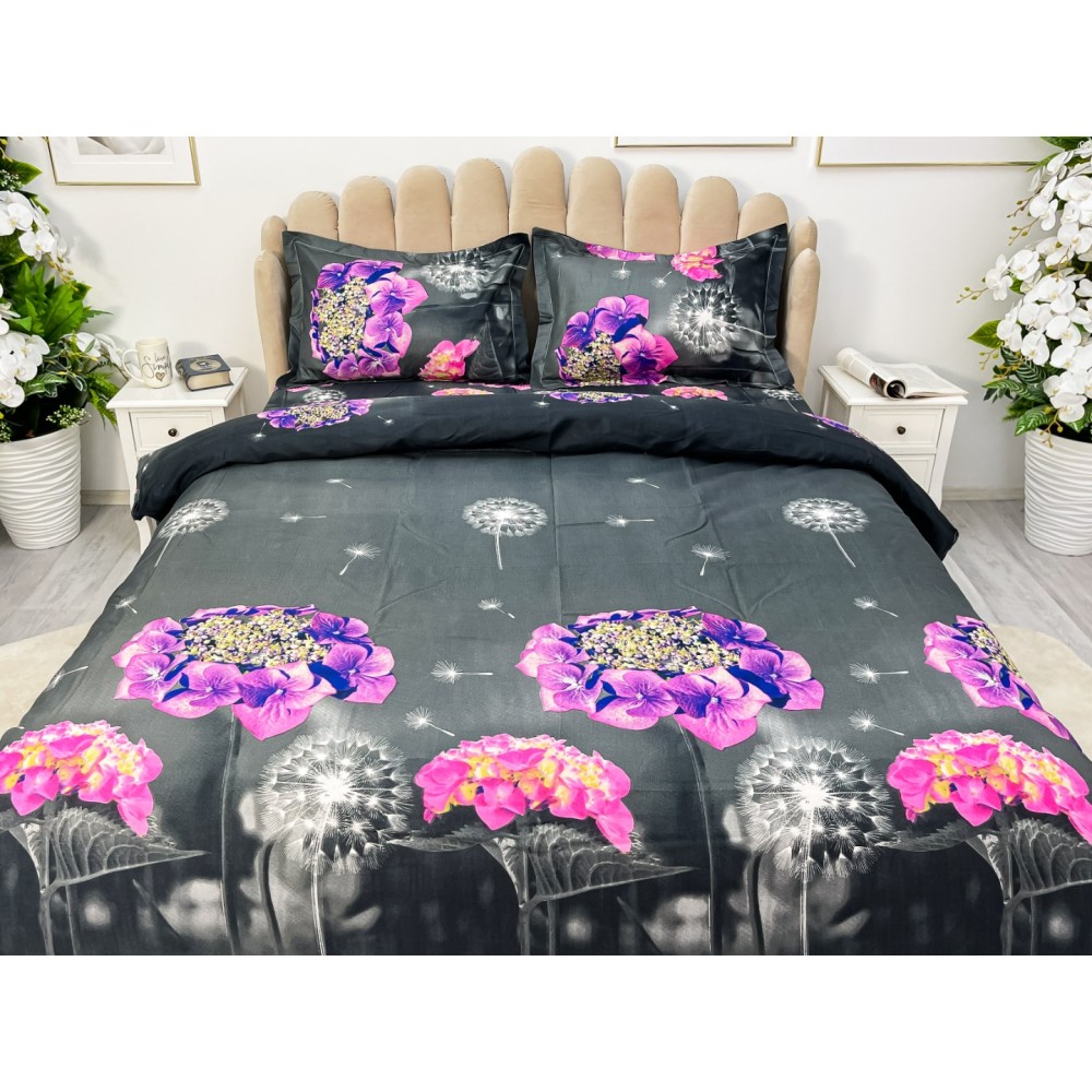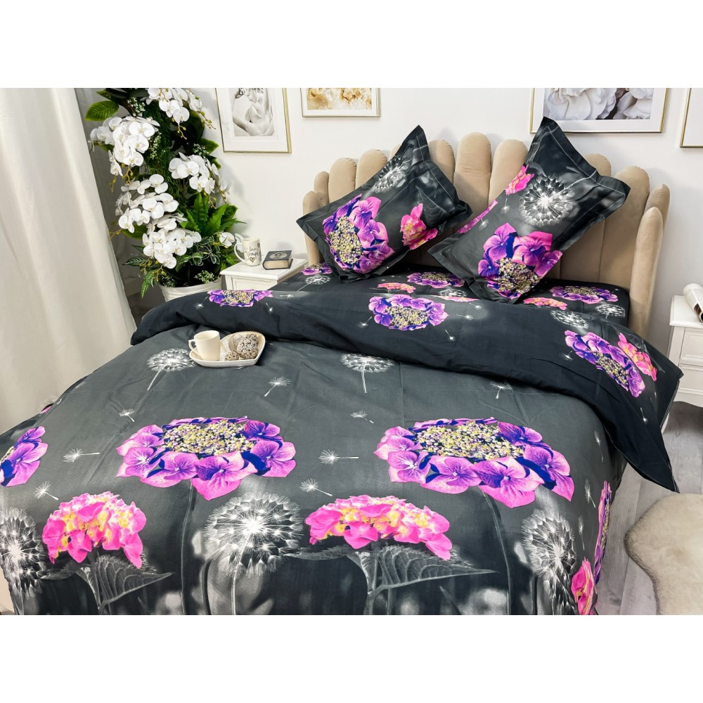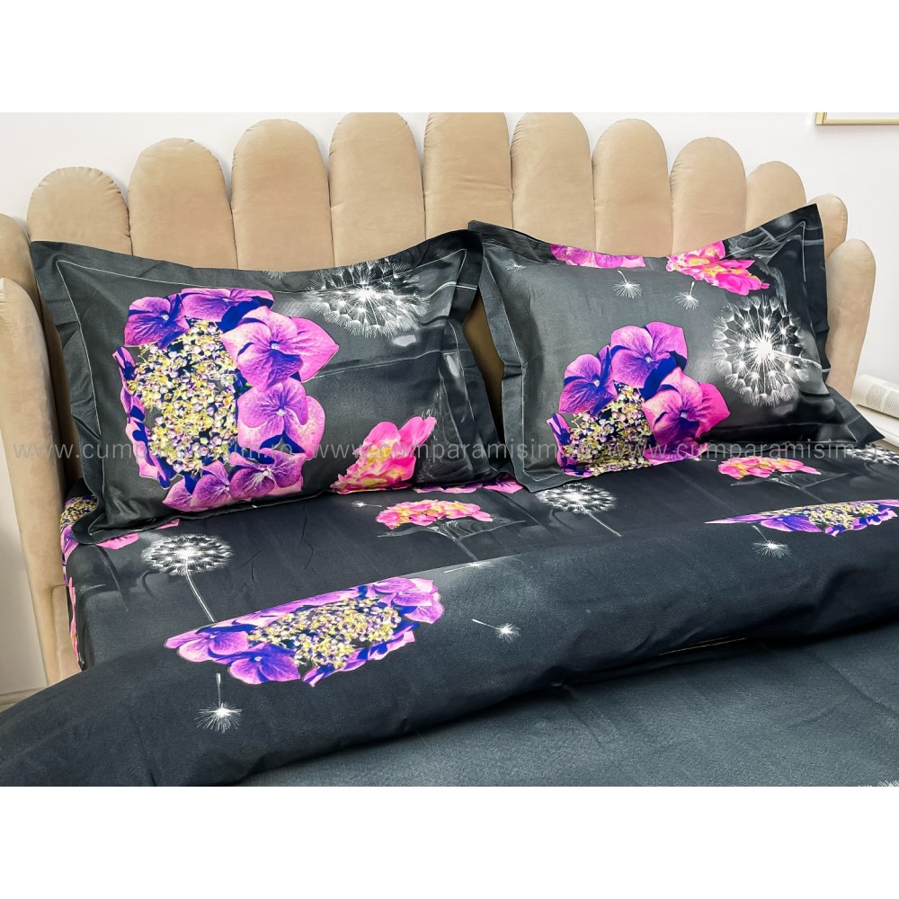 Lenjerie pat dublu, 4 piese, IMPRIMEU 3D Multiplicat, Microfibra, Mov, hortensii, Johny Home Pucioasa, cod produs: SPR-B-489