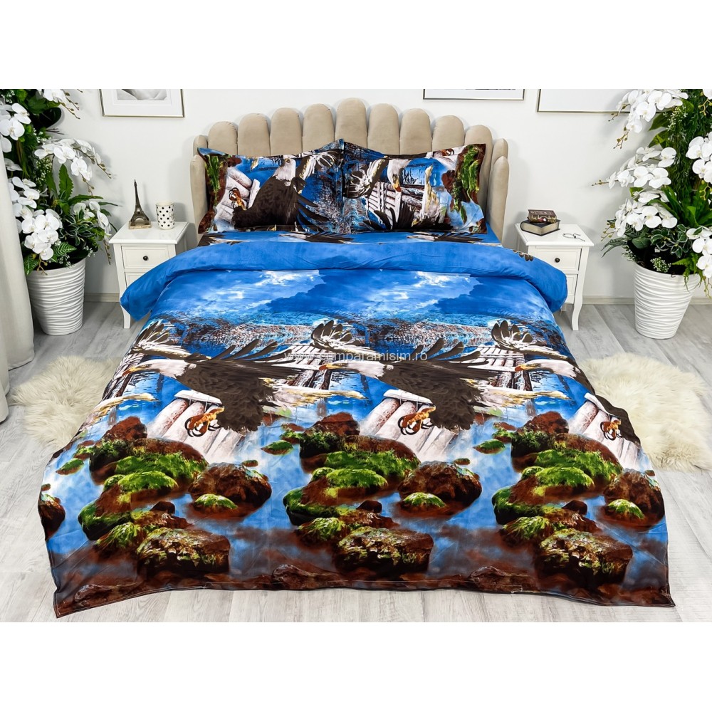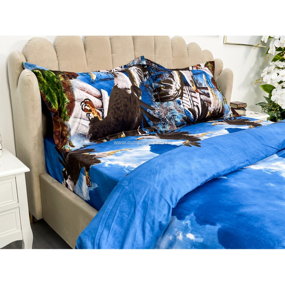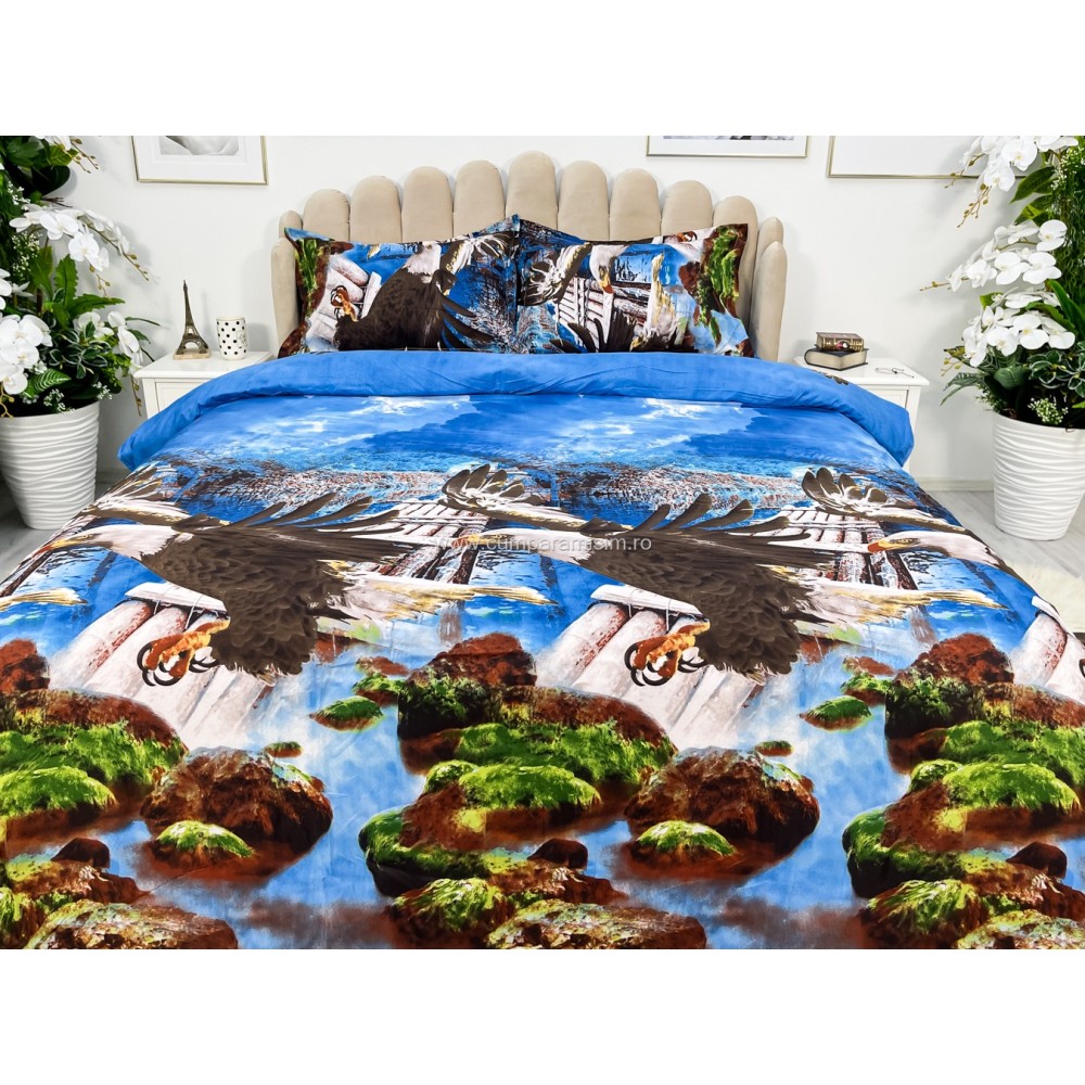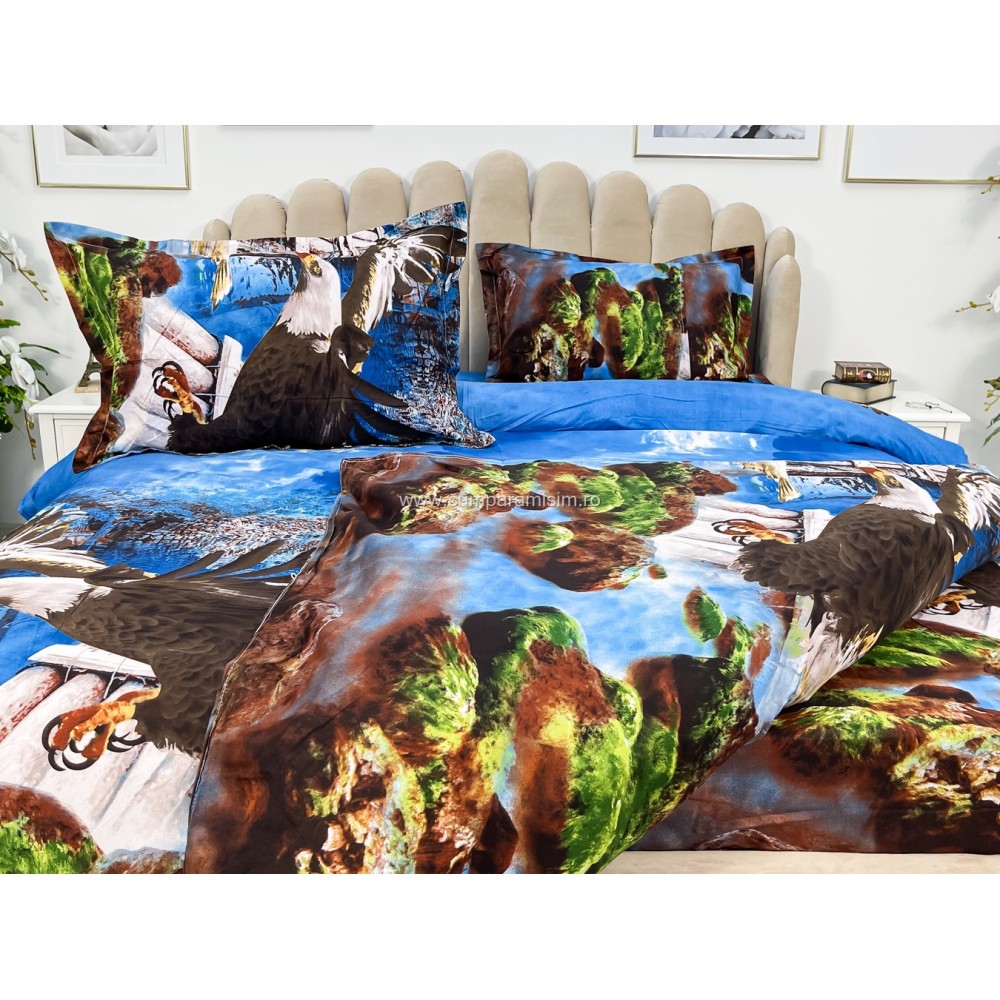 Lenjerie pat dublu, 4 piese, IMPRIMEU 3D Multiplicat, Microfibra, Albastru, vulturi, Johny Home Pucioasa, cod produs: SPR-B-507