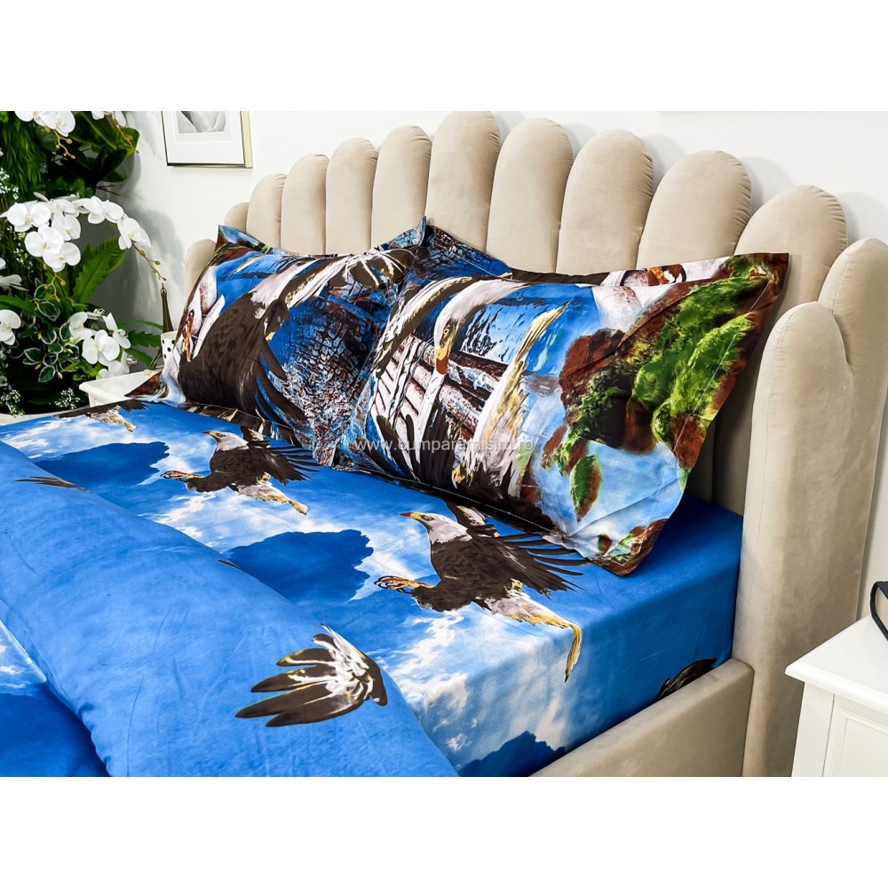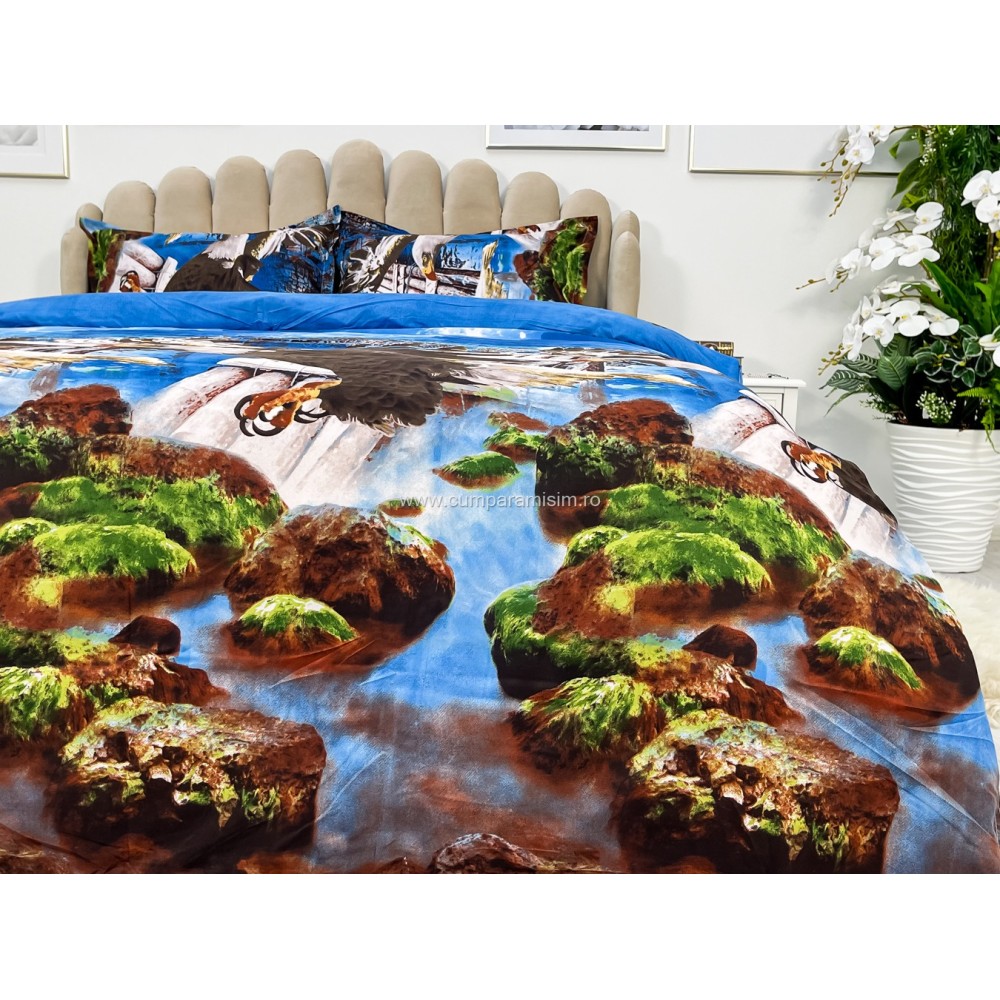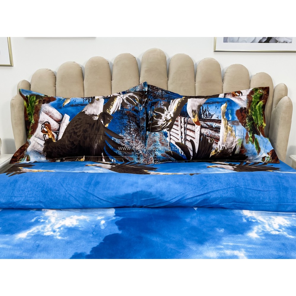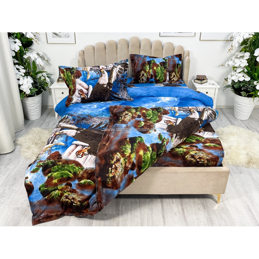 Lenjerie pat dublu, 4 piese, IMPRIMEU 3D Multiplicat, Microfibra, Albastru, vulturi, Johny Home Pucioasa, cod produs: SPR-B-507