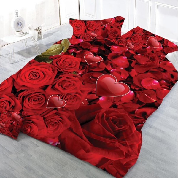 Lenjerie pat dublu, 4 piese, IMPRIMEU 3D Multiplicat, Microfibra, Rosu, trandafiri, inimioare, Johny Home Pucioasa, cod produs: SPR-B-509
