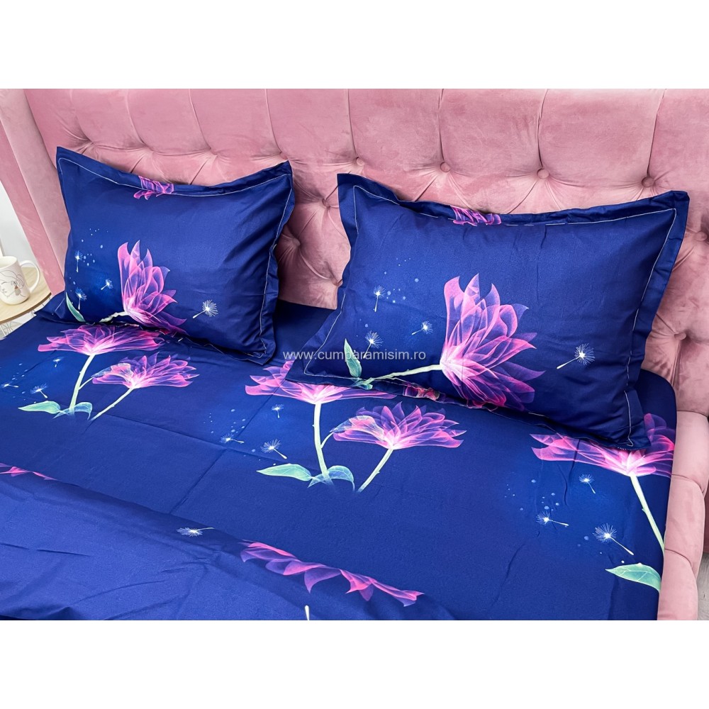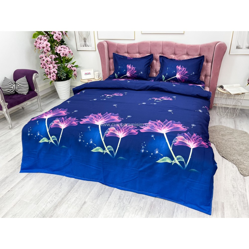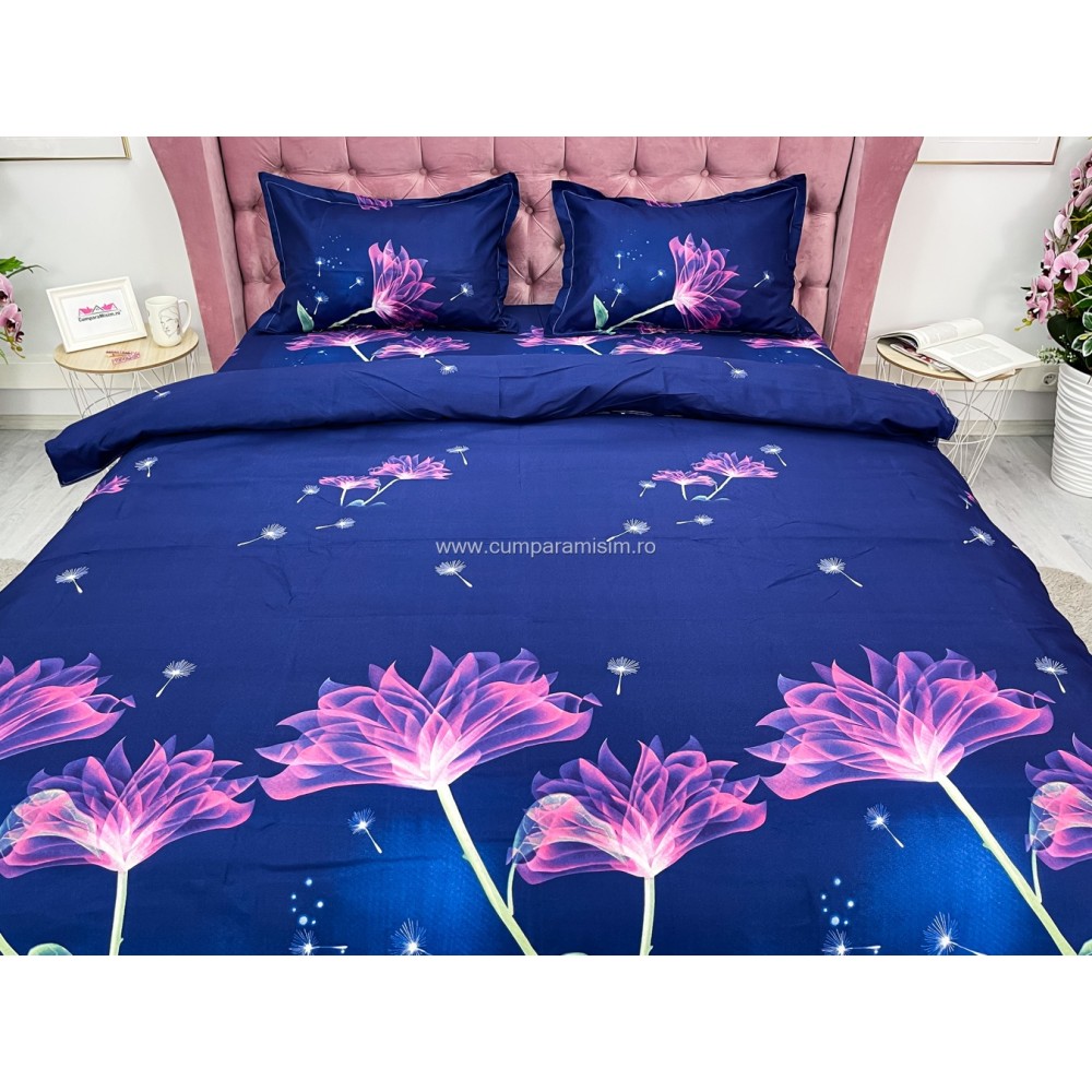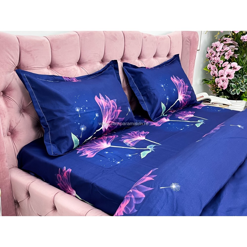 Lenjerie pat dublu, 4 piese, IMPRIMEU 3D Multiplicat, Microfibra, Mov, flori, Johny Home Pucioasa, cod produs: SPR-B-533