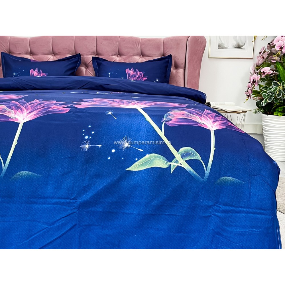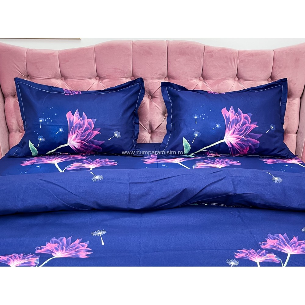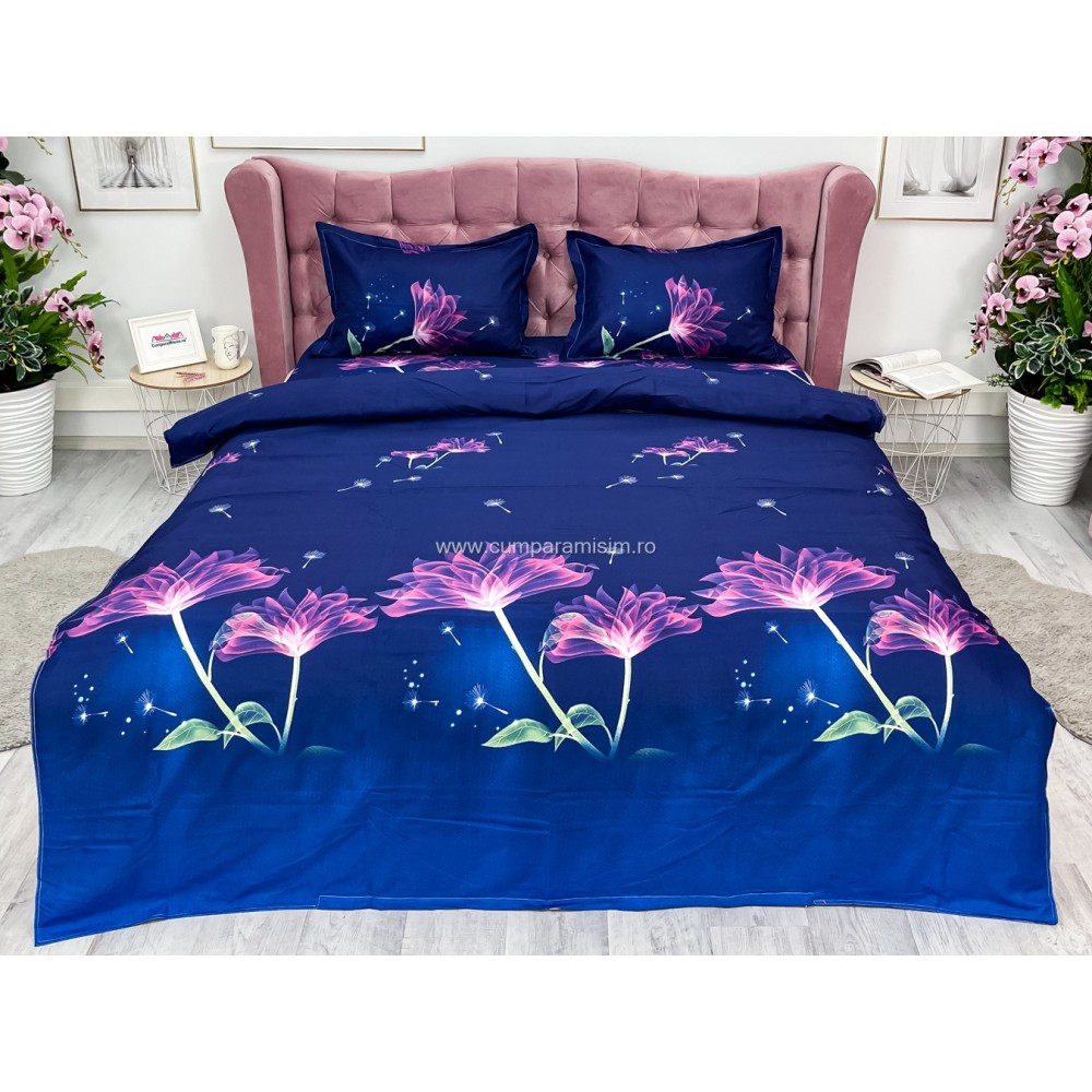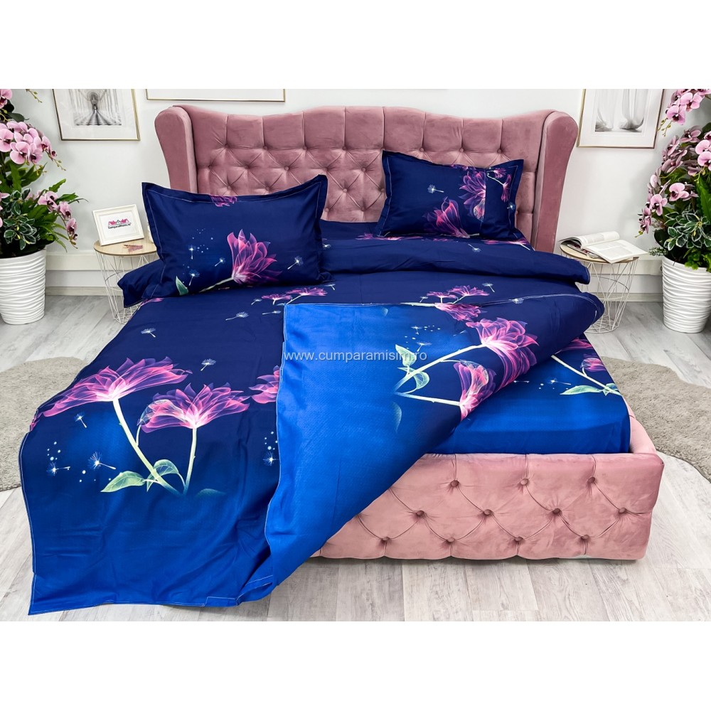 Lenjerie pat dublu, 4 piese, IMPRIMEU 3D Multiplicat, Microfibra, Mov, flori, Johny Home Pucioasa, cod produs: SPR-B-533