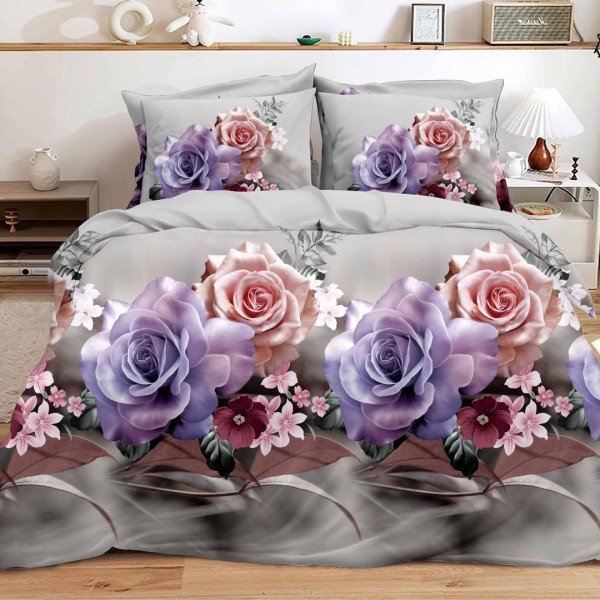 Lenjerie pat dublu, 4 piese, IMPRIMEU 3D Multiplicat Multiplicat, Microfibra, Lila, trandafiri, Johny Home Pucioasa, cod produs: SPR-B-558