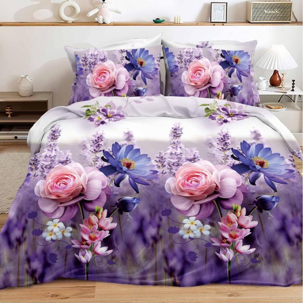 Lenjerie pat dublu, 4 piese, IMPRIMEU 3D Multiplicat Multiplicat, Microfibra, Mov, flori, Johny Home Pucioasa, cod produs: SPR-B-559