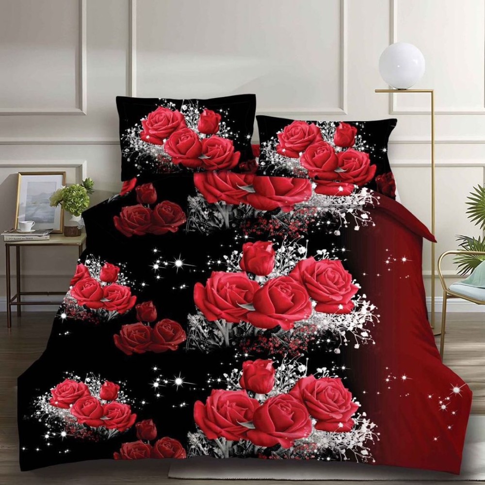 Lenjerie pat dublu, 4 piese, IMPRIMEU 3D Multiplicat Multiplicat, Microfibra, Rosu-Negru, trandafiri, Johny Home Pucioasa, cod produs: SPR-B-574