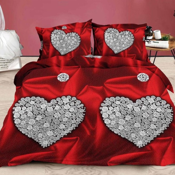 Lenjerie pat dublu, 4 piese, IMPRIMEU 3D Multiplicat Multiplicat, Microfibra, Rosu, inimioare, Johny Home Pucioasa, cod produs: SPR-B-576