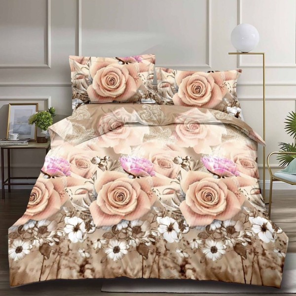 Lenjerie pat dublu, 4 piese, IMPRIMEU 3D Multiplicat Multiplicat, Microfibra, Bej, flori, Johny Home Pucioasa, cod produs: SPR-B-578