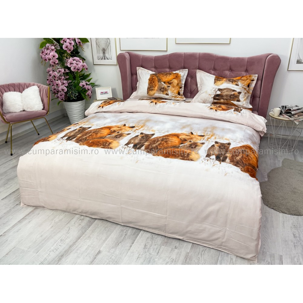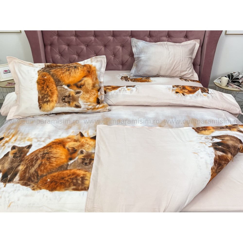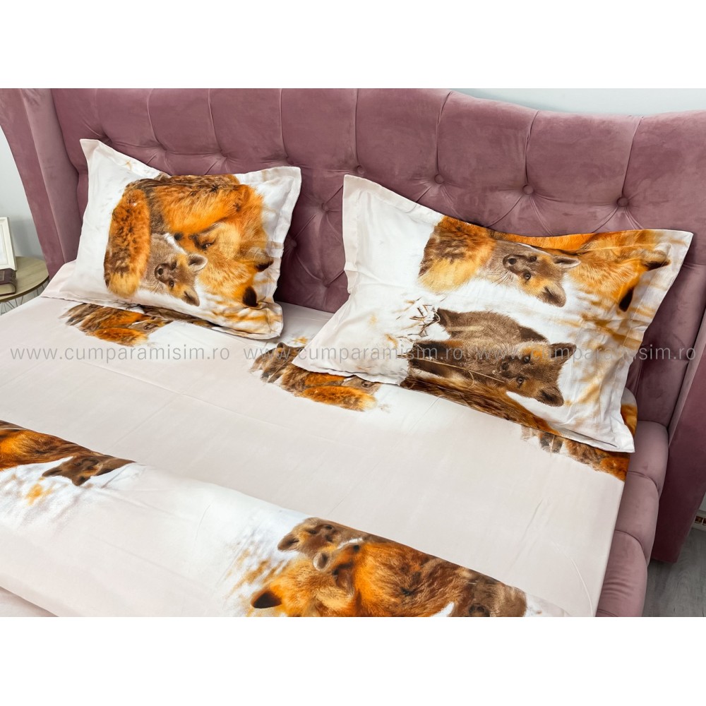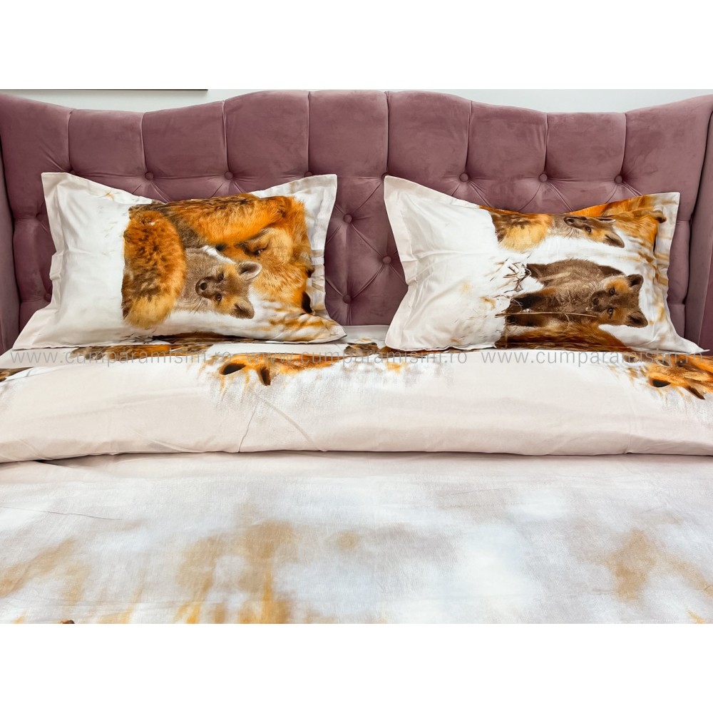 Lenjerie pat dublu, 4 piese, IMPRIMEU 3D Multiplicat, Microfibra, Maro, vulpi, Johny Home Pucioasa, cod produs: SPR-B-432