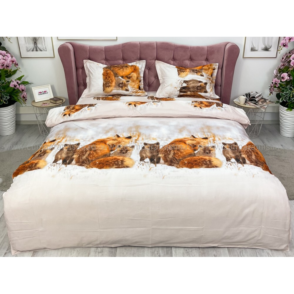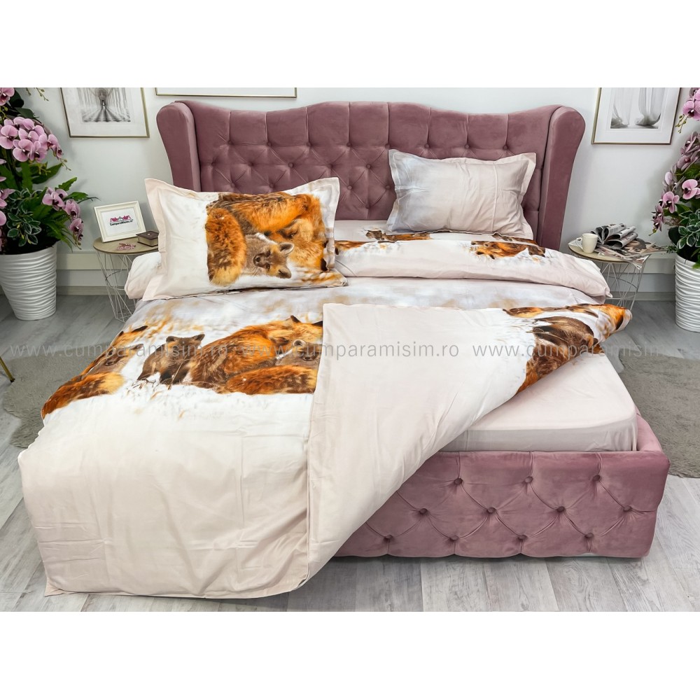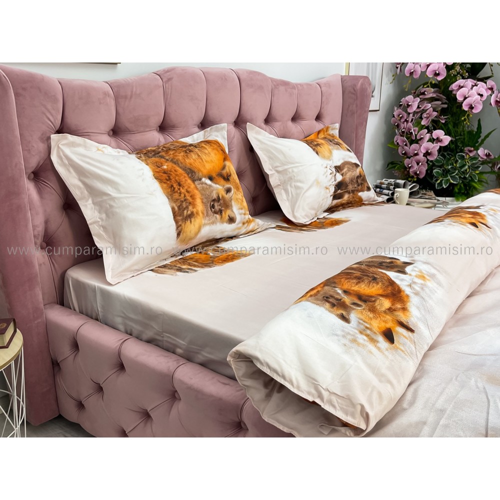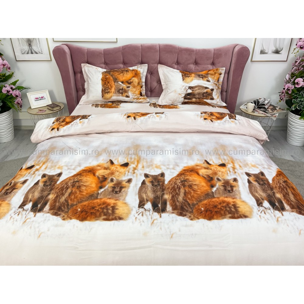 Lenjerie pat dublu, 4 piese, IMPRIMEU 3D Multiplicat, Microfibra, Maro, vulpi, Johny Home Pucioasa, cod produs: SPR-B-432