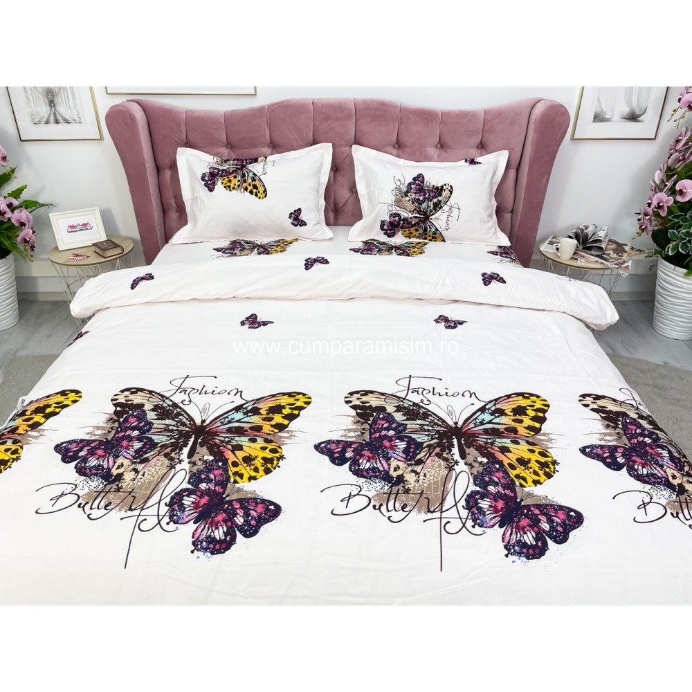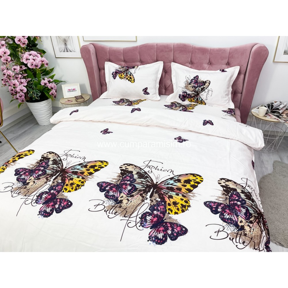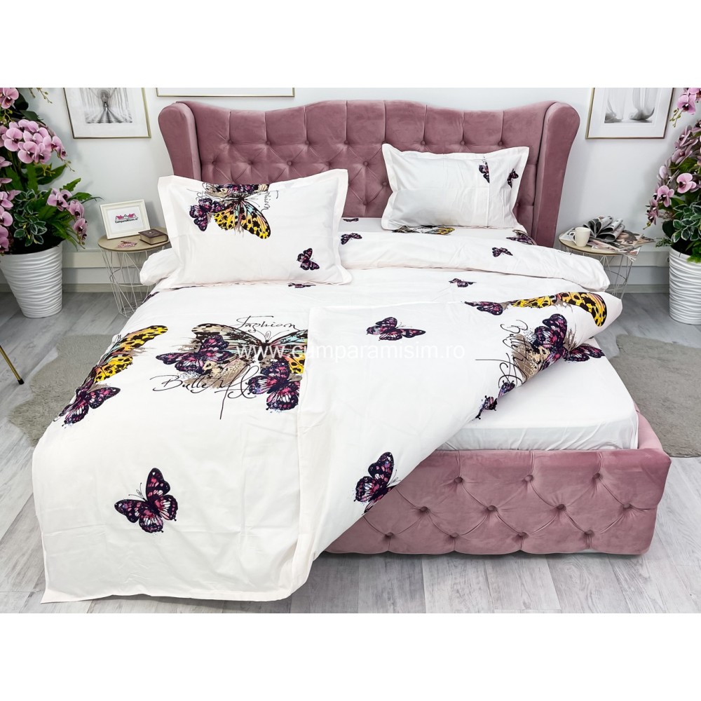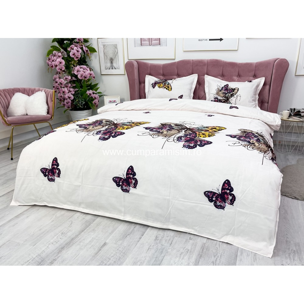 Lenjerie pat dublu, 4 piese, IMPRIMEU 3D Multiplicat, Microfibra, Mov, fluturi, Johny Home Pucioasa, cod produs: SPR-B-477