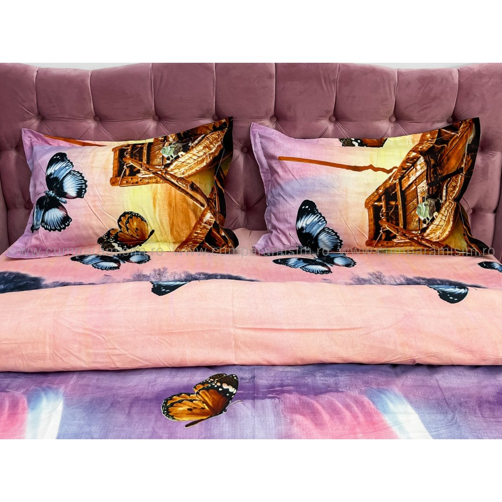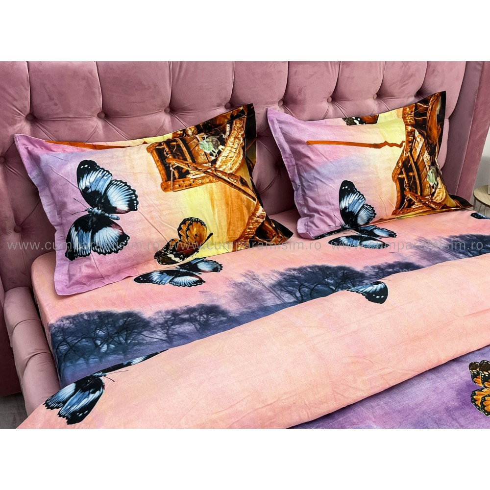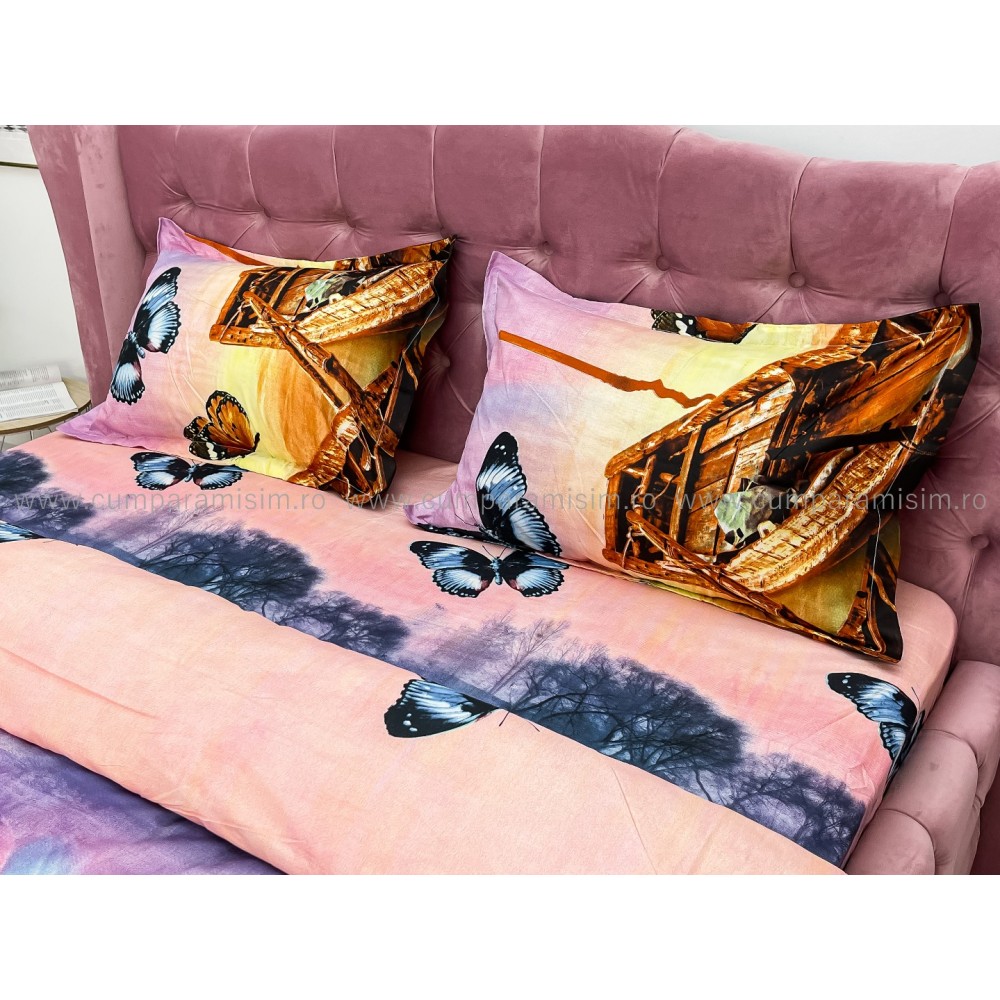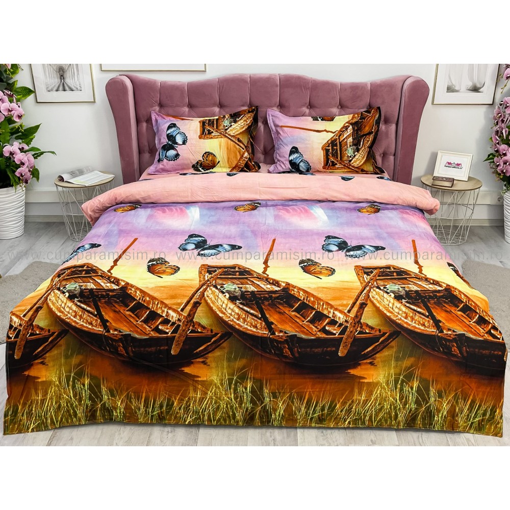 Lenjerie pat dublu, 4 piese, IMPRIMEU 3D Multiplicat, Microfibra, Maro, barci, fluturi, Johny Home Pucioasa, cod produs: SPR-B-522