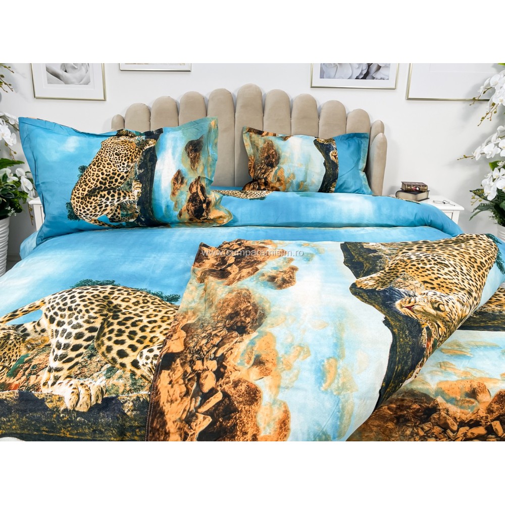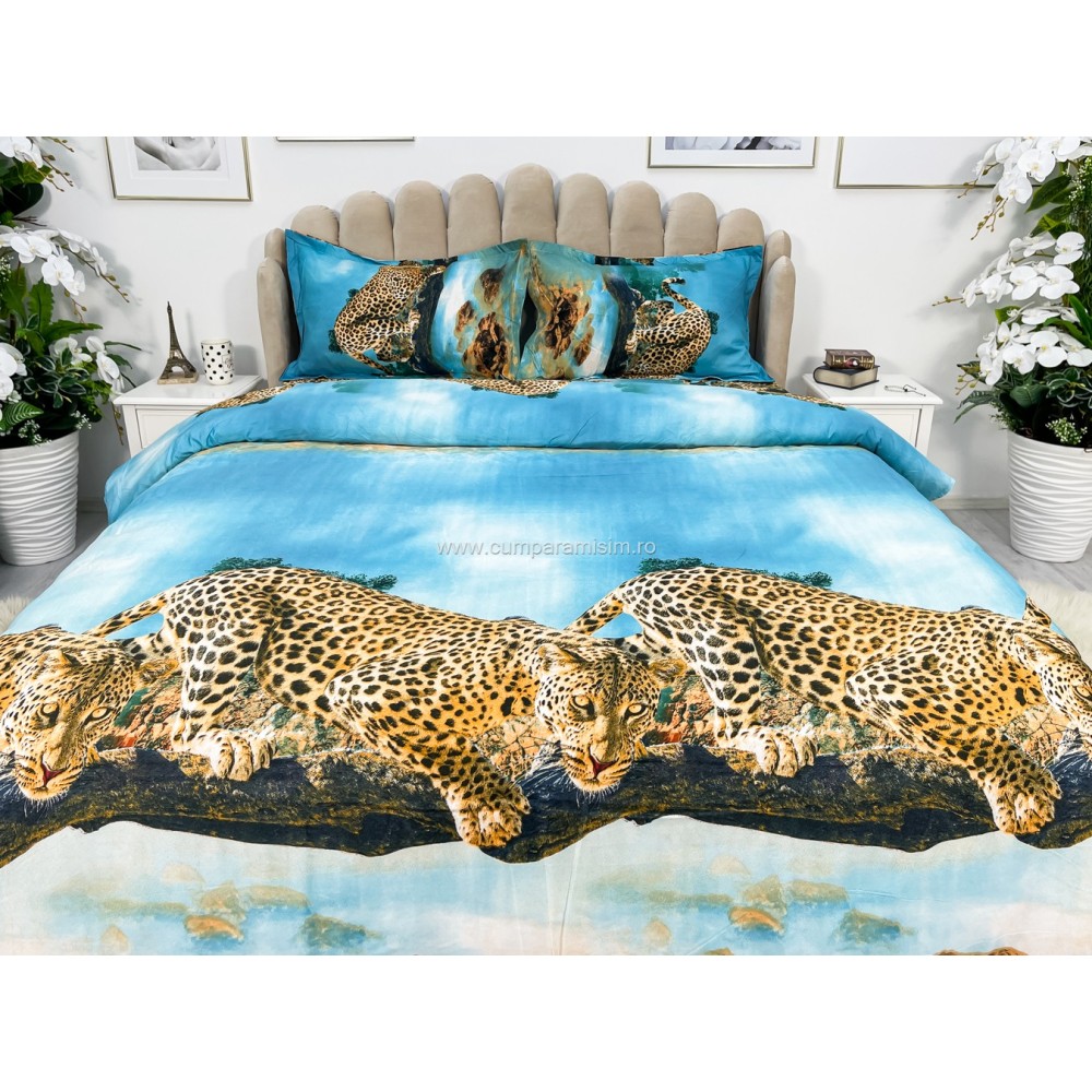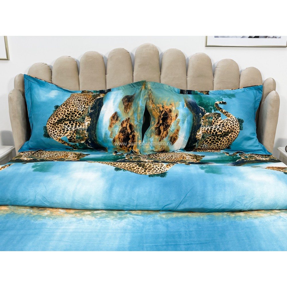 Lenjerie pat dublu, 4 piese, IMPRIMEU 3D Multiplicat, Microfibra, Bleu, leoparzi, Johny Home Pucioasa, cod produs: SPR-B-557