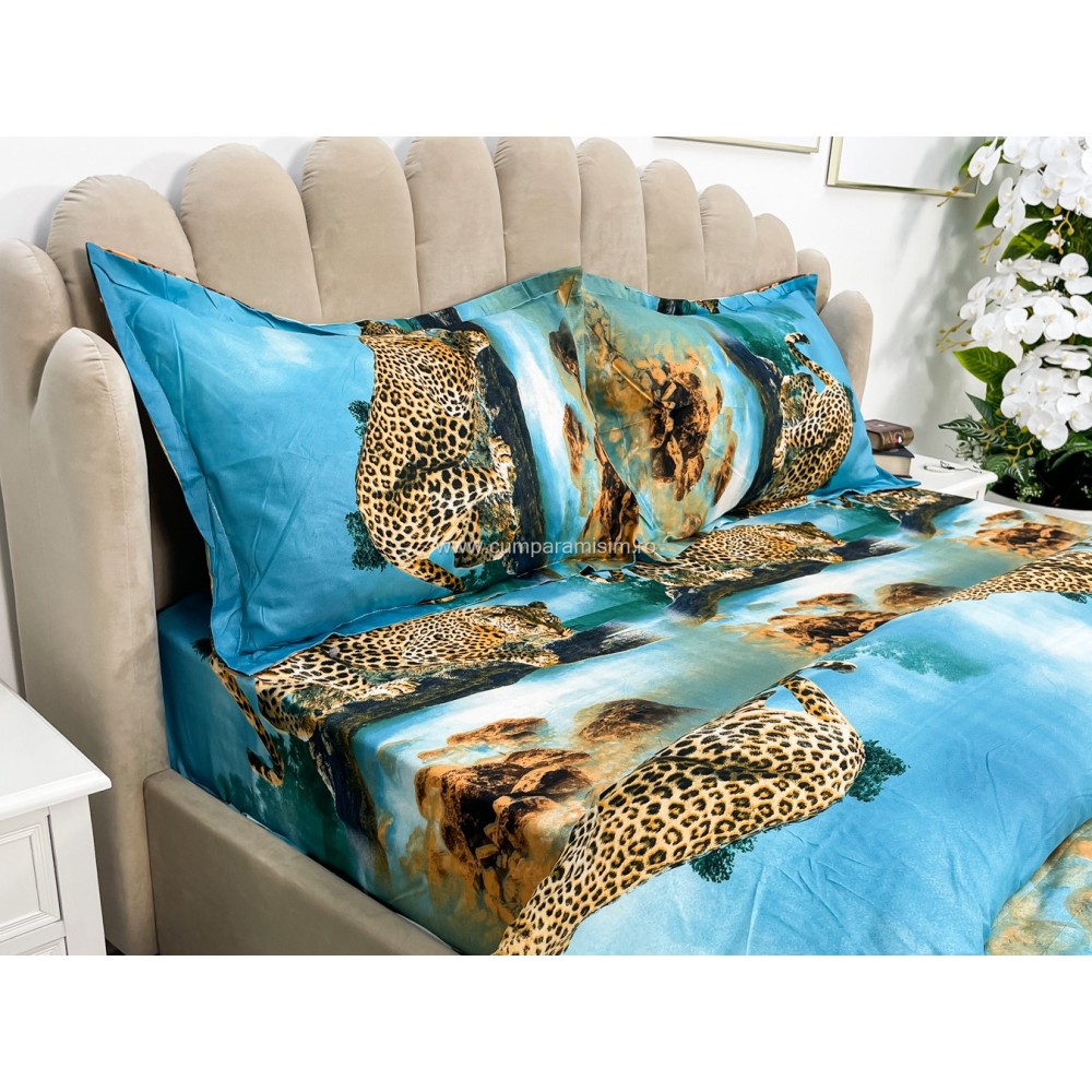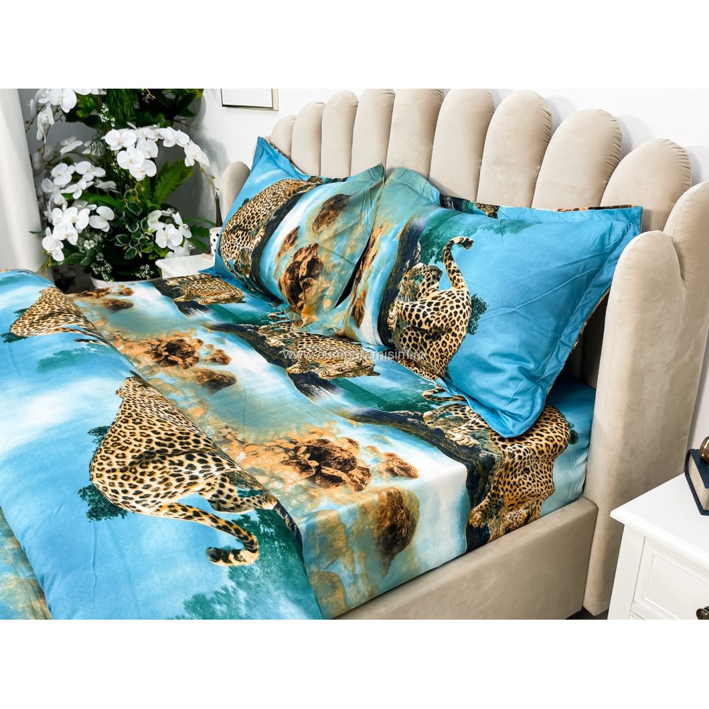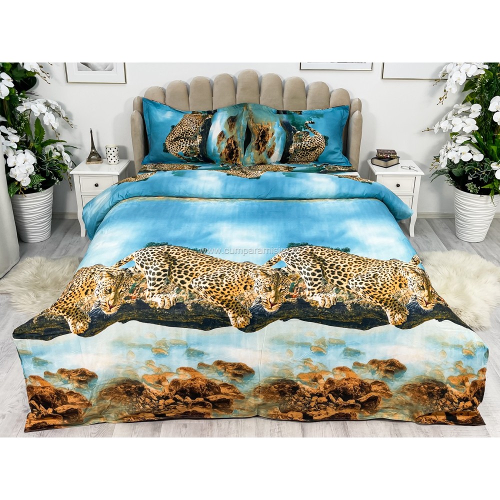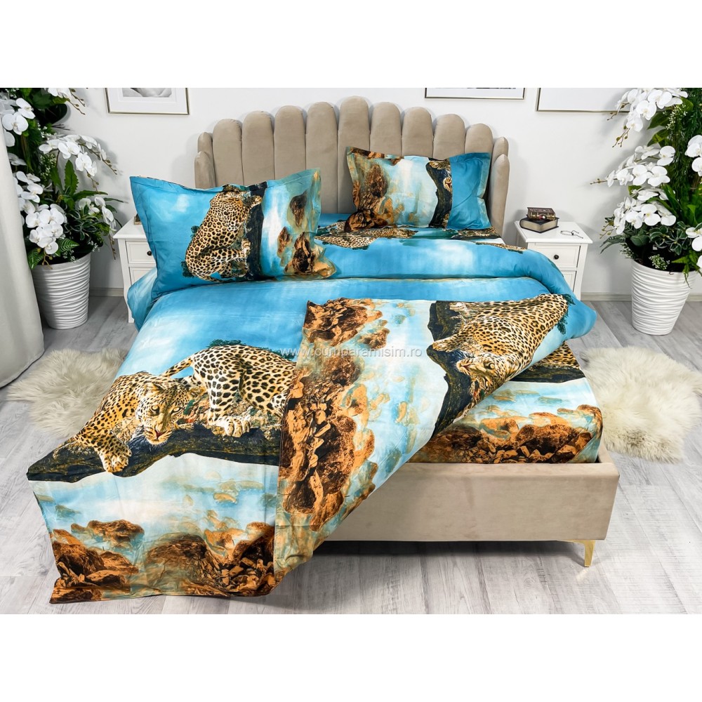 Lenjerie pat dublu, 4 piese, IMPRIMEU 3D Multiplicat, Microfibra, Bleu, leoparzi, Johny Home Pucioasa, cod produs: SPR-B-557