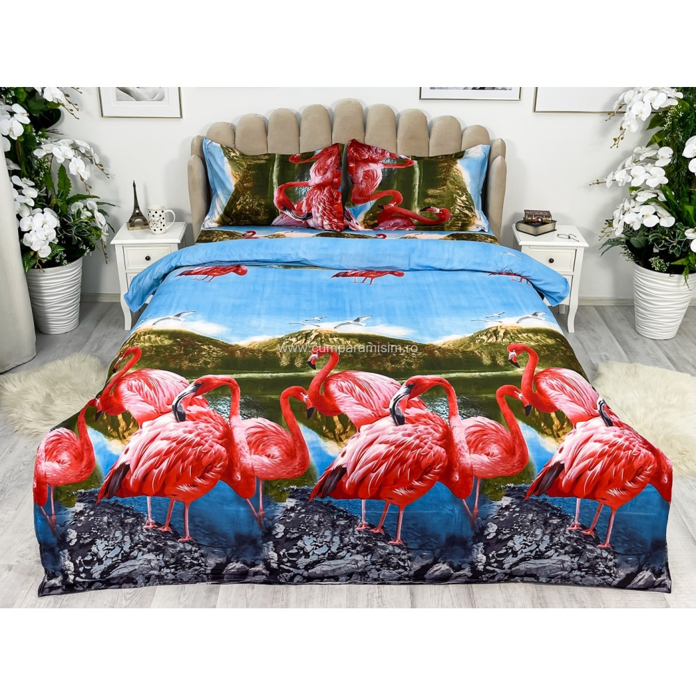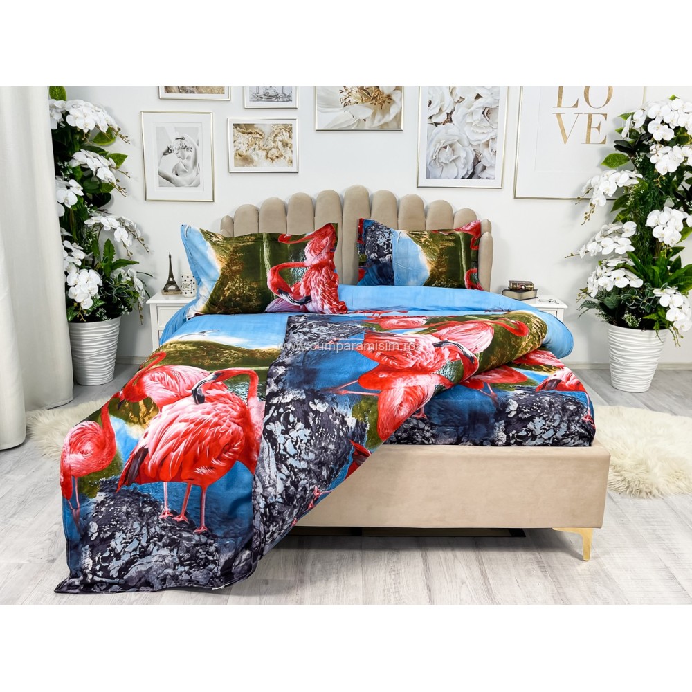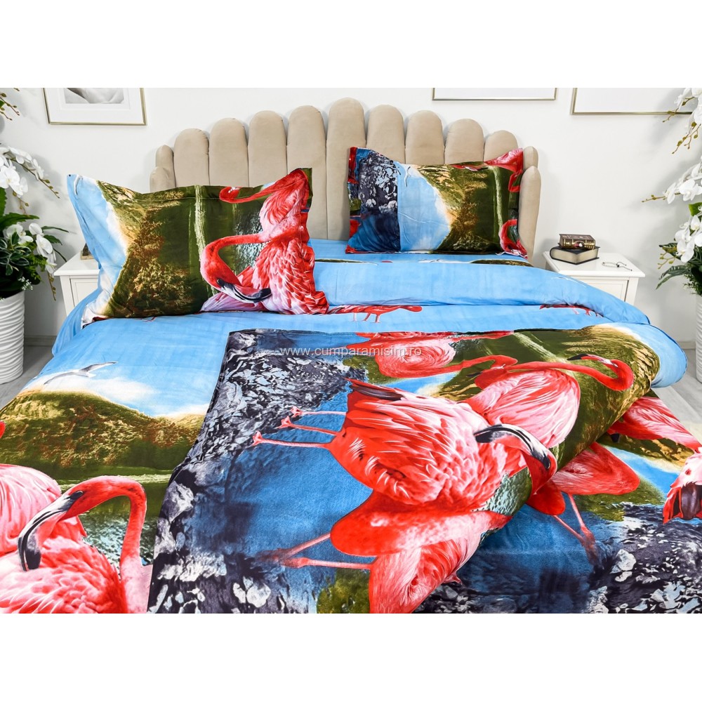 Lenjerie pat dublu, 4 piese, IMPRIMEU 3D Multiplicat, Microfibra, Albastru, flamingo, Johny Home Pucioasa, cod produs: SPR-B-571