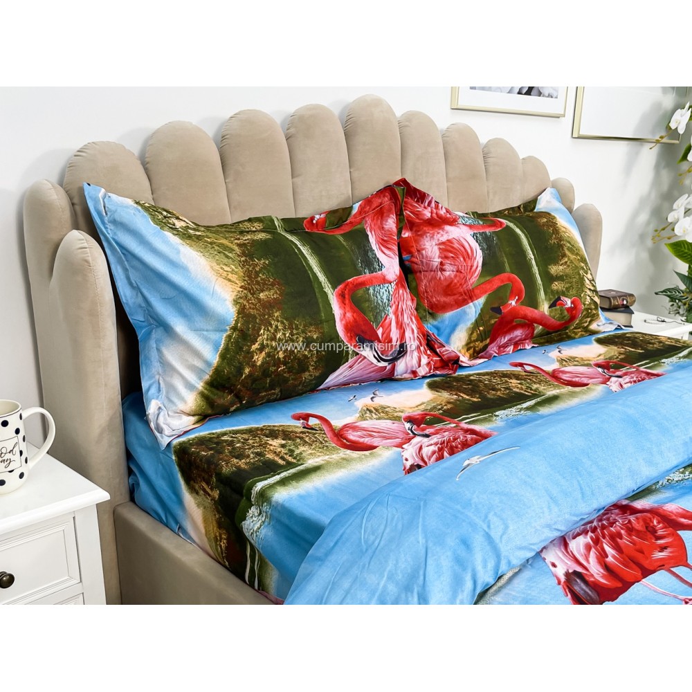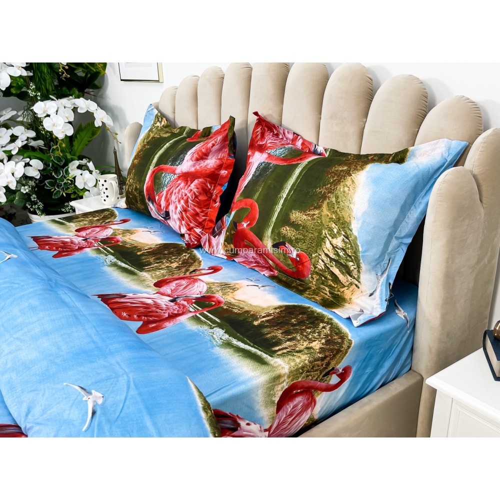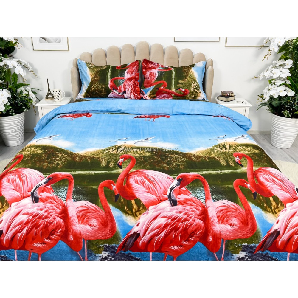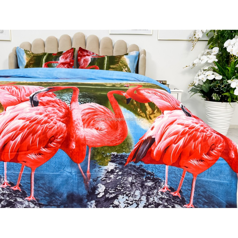 Lenjerie pat dublu, 4 piese, IMPRIMEU 3D Multiplicat, Microfibra, Albastru, flamingo, Johny Home Pucioasa, cod produs: SPR-B-571