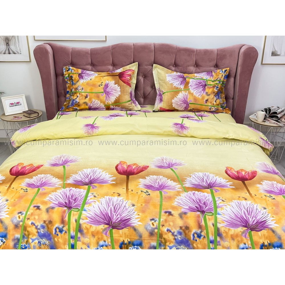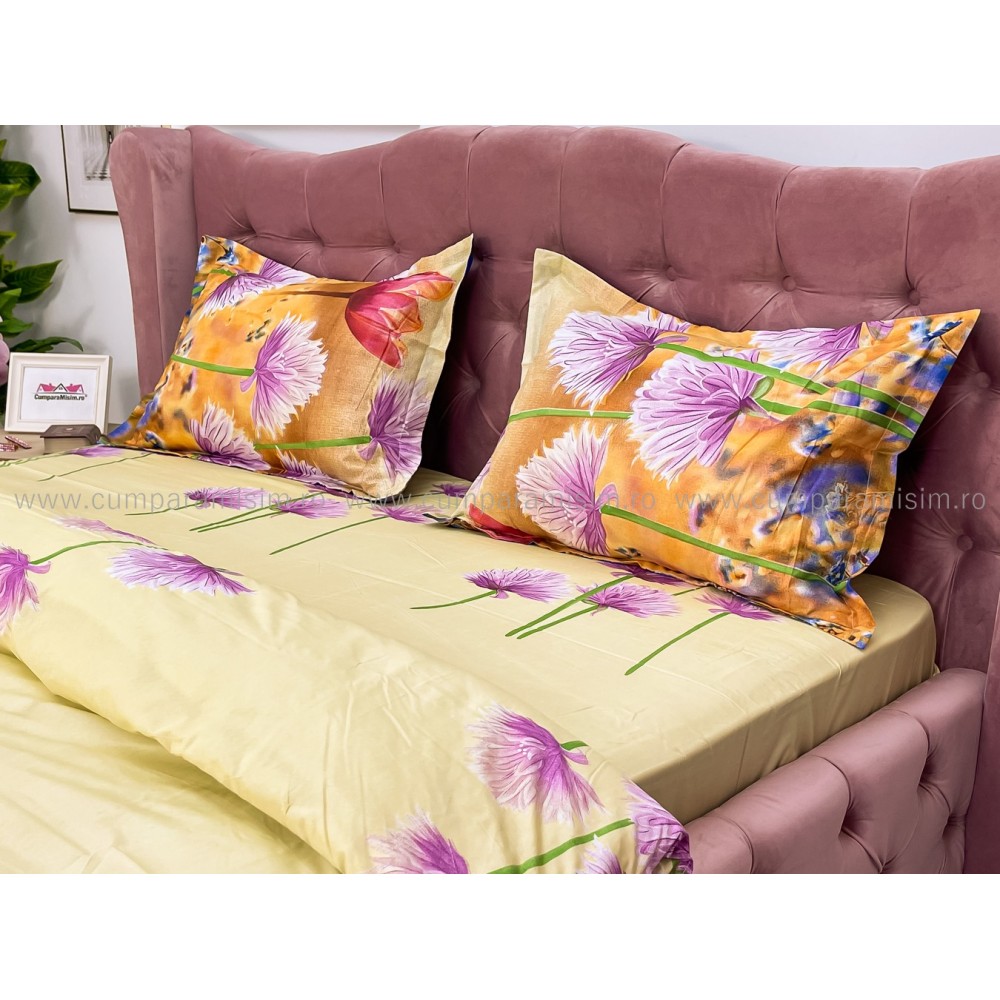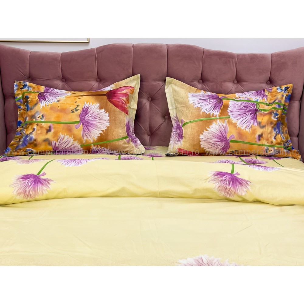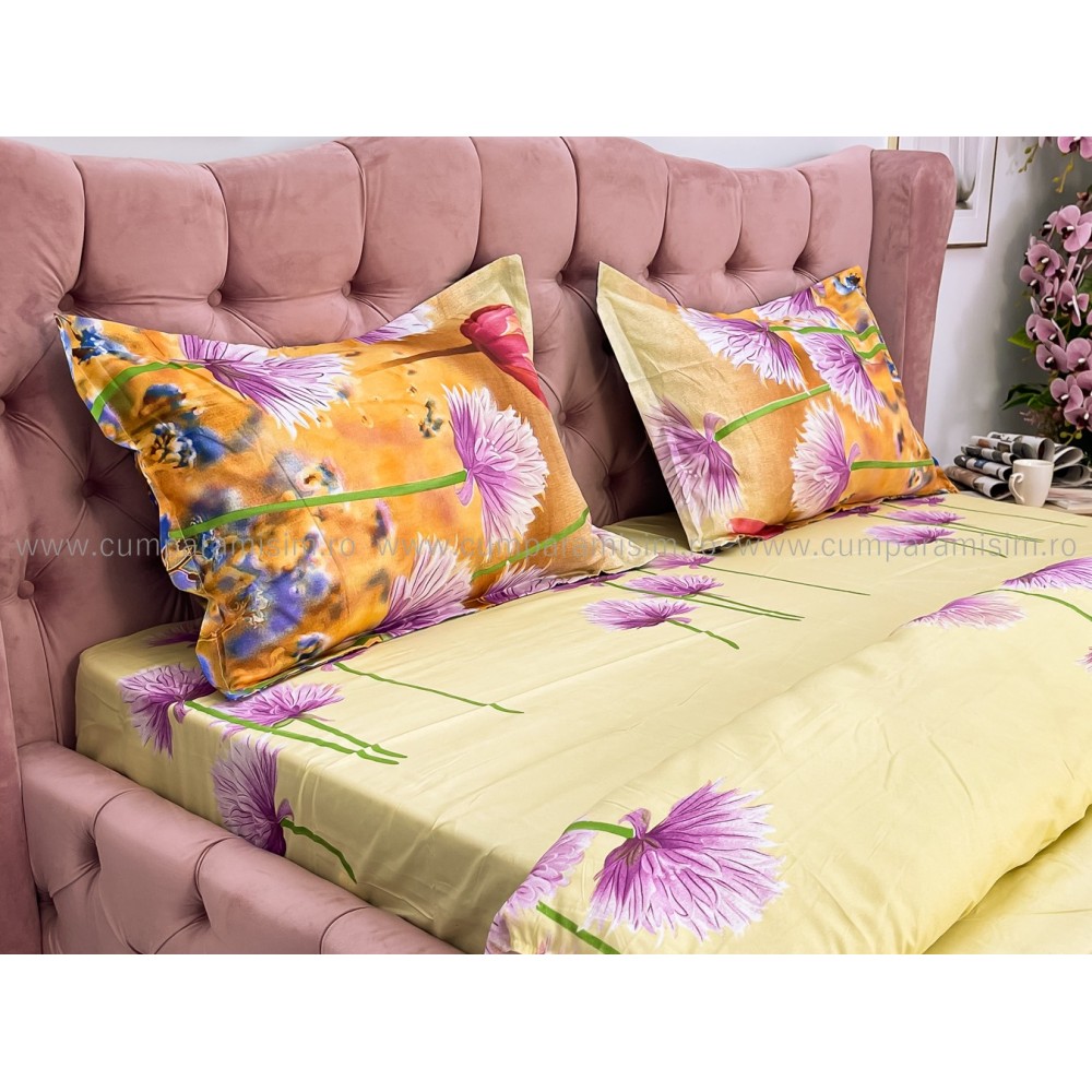 Lenjerie pat dublu, 4 piese, IMPRIMEU 3D Multiplicat, Microfibra, Mov, flori, Johny Home Pucioasa, cod produs: SPR-B-596