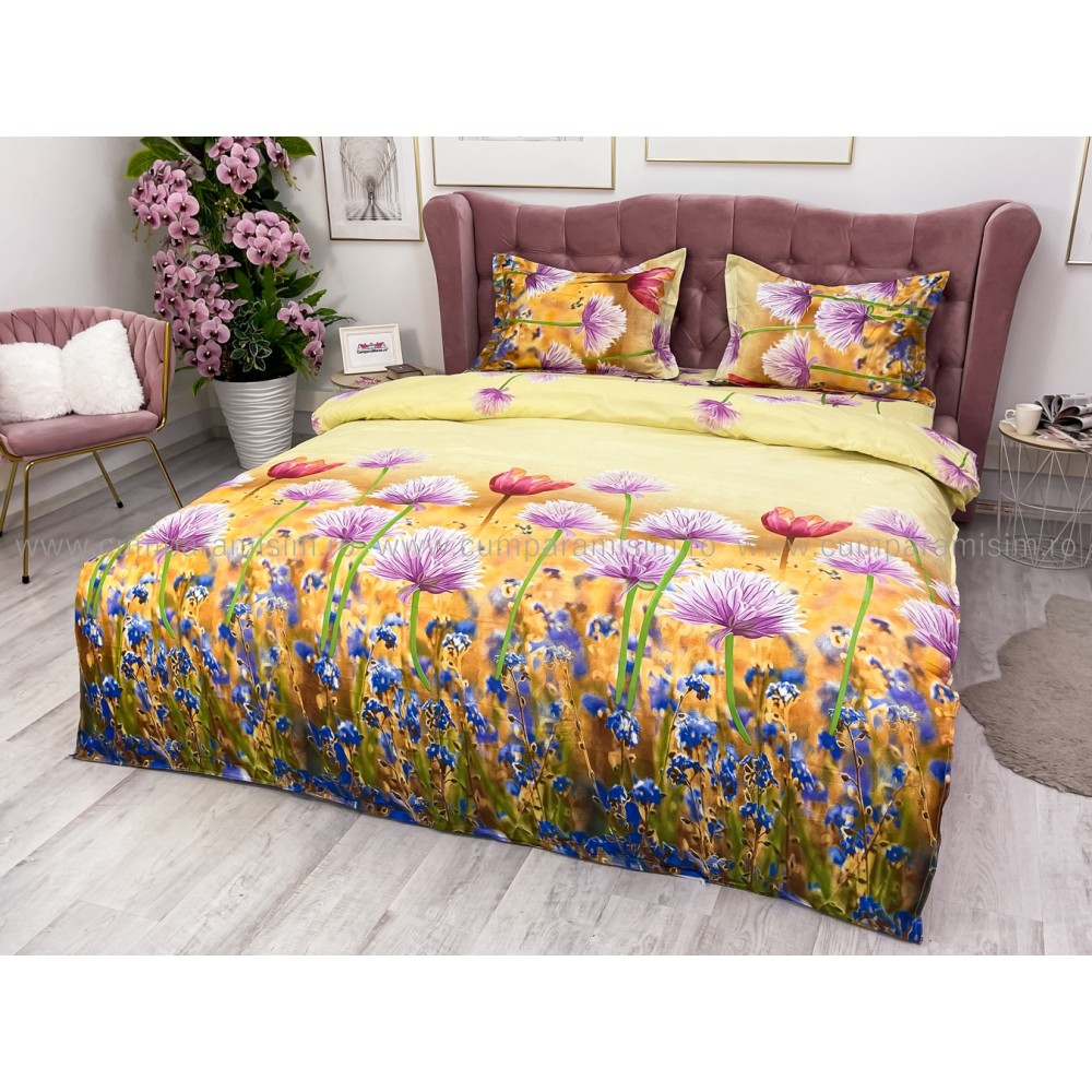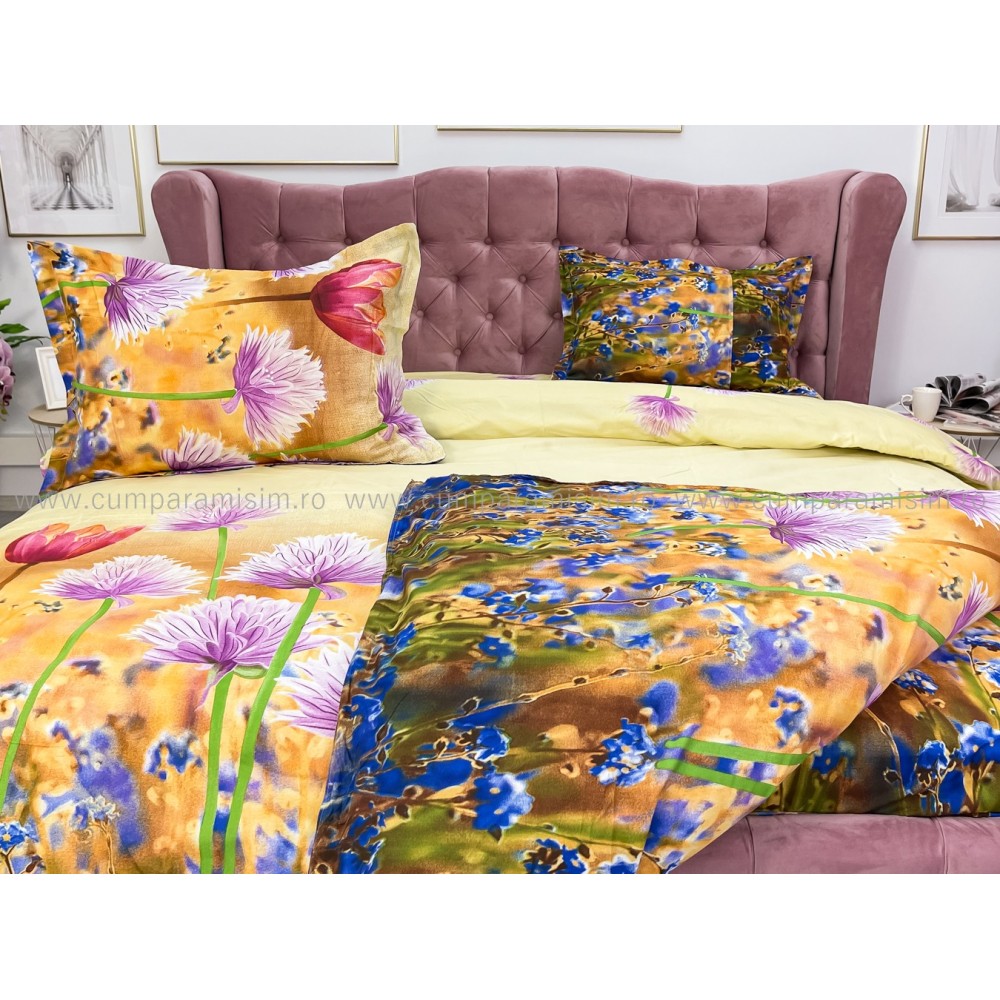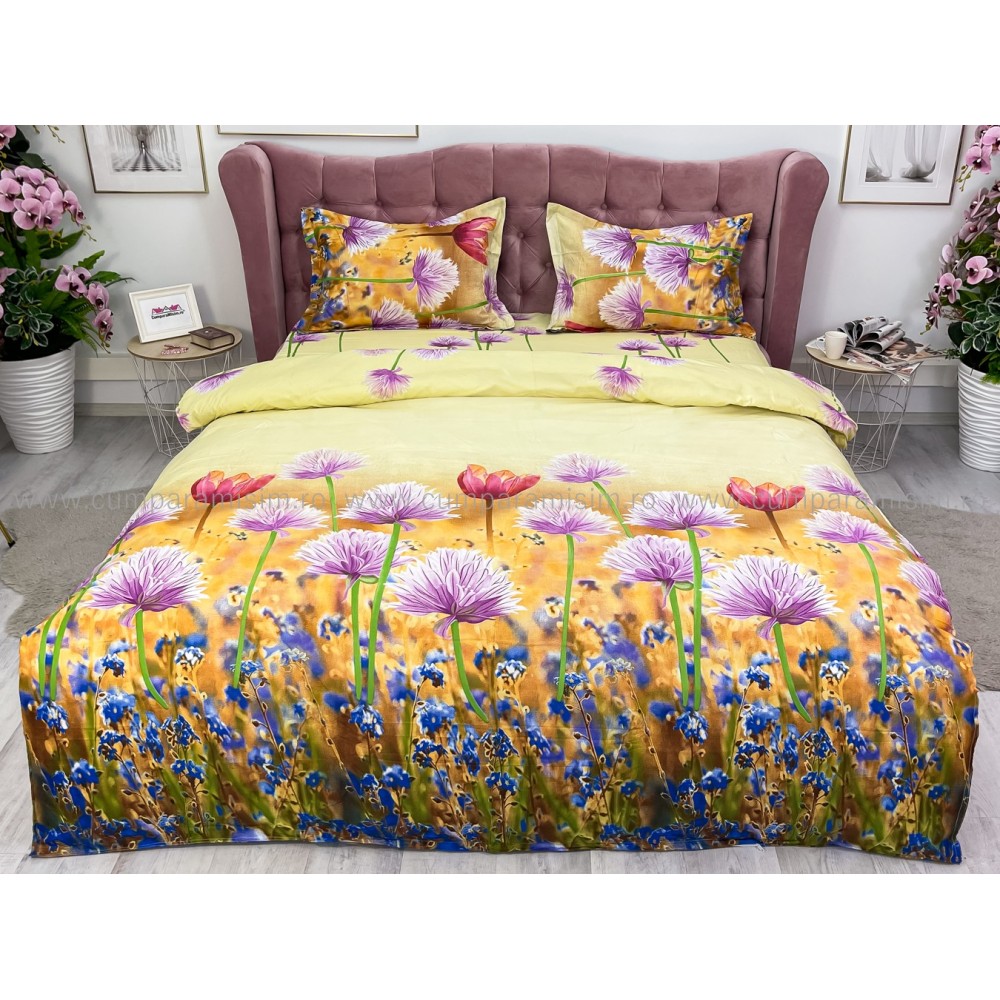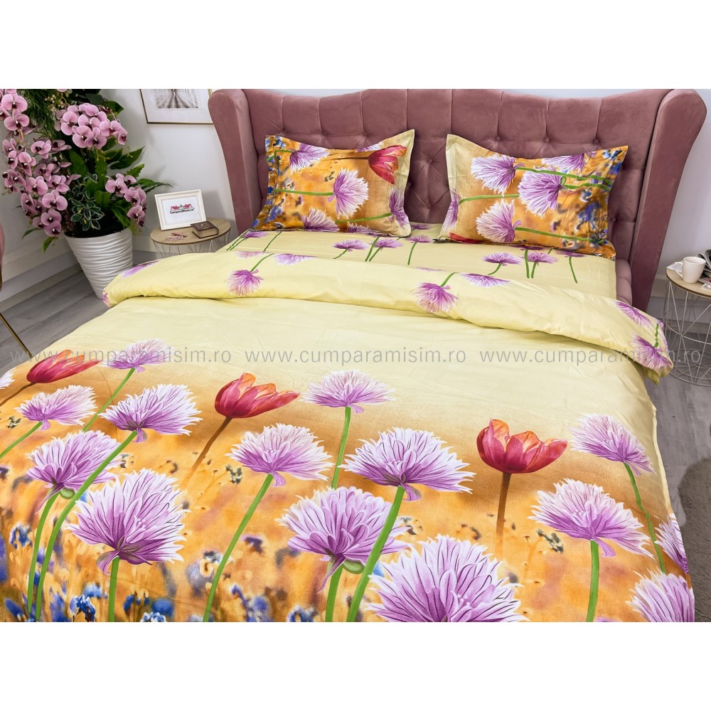 Lenjerie pat dublu, 4 piese, IMPRIMEU 3D Multiplicat, Microfibra, Mov, flori, Johny Home Pucioasa, cod produs: SPR-B-596