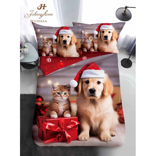 Lenjerie pat 1 PERSOANA, BUMBAC FINET, 4 piese, Identică cu Poza, Craciun, Gri, Roșu, pisica, cățel, golden retriever, Johny Home Pucioasa, cod produs: SPR-Qy-04