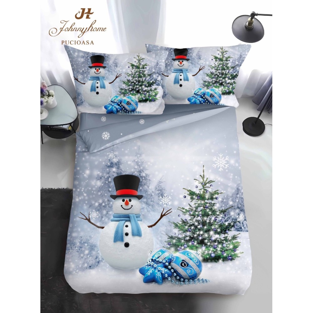Lenjerie pat 1 PERSOANA, BUMBAC FINET, 4 piese, Identică cu Poza, Craciun, Gri, Bleu, om de zăpadă, brad, Johny Home Pucioasa, cod produs: SPR-Qy-05