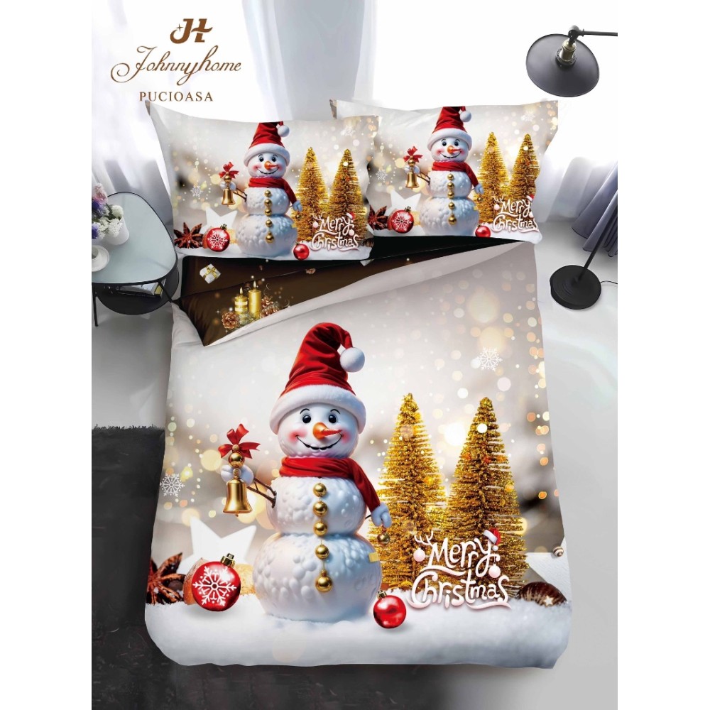 Lenjerie pat 1 PERSOANA, BUMBAC FINET, 4 piese, Identică cu Poza, Craciun, Gri, Multicolor, om de zăpadă, brazi, clopotel, Johny Home Pucioasa, cod produs: SPR-Qy-11