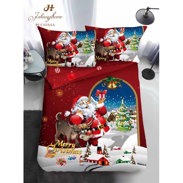 Lenjerie pat 1 PERSOANA, BUMBAC FINET, 4 piese, Identică cu Poza, Craciun, Roșu, Multicolor, Moș Crăciun, Rudolf, Johny Home Pucioasa, cod produs: SPR-Qy-14