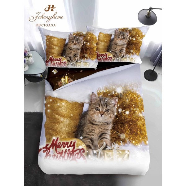 Lenjerie pat 1 PERSOANA, BUMBAC FINET, 4 piese, Identică cu Poza, Craciun, Gri, Auriu, pisicuță, beteala, cizma, Johny Home Pucioasa, cod produs: SPR-Qy-16