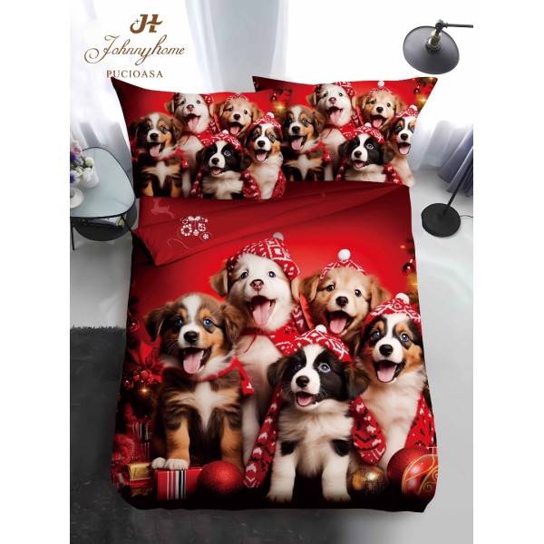 Lenjerie pat 1 PERSOANA, BUMBAC FINET, 4 piese, Identică cu Poza, Craciun, Roșu, catelusi, Johny Home Pucioasa, cod produs: SPR-Qy-21