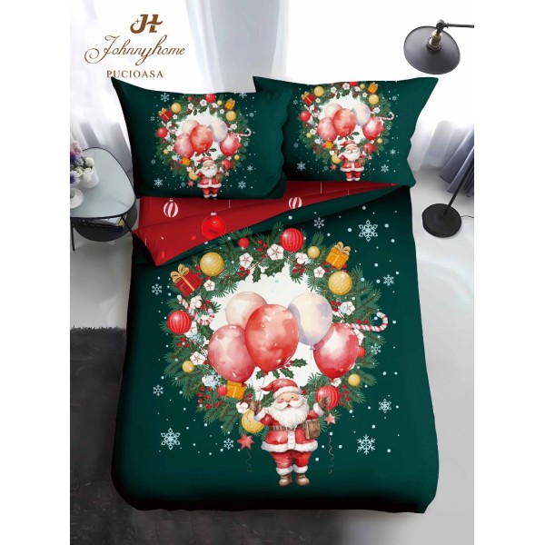 Lenjerie pat 1 PERSOANA, BUMBAC FINET, 4 piese, Identică cu Poza, Craciun, Verde, Rosu, Moș Crăciun, coroniță de brad, Johny Home Pucioasa, cod produs: SPR-Qy-26