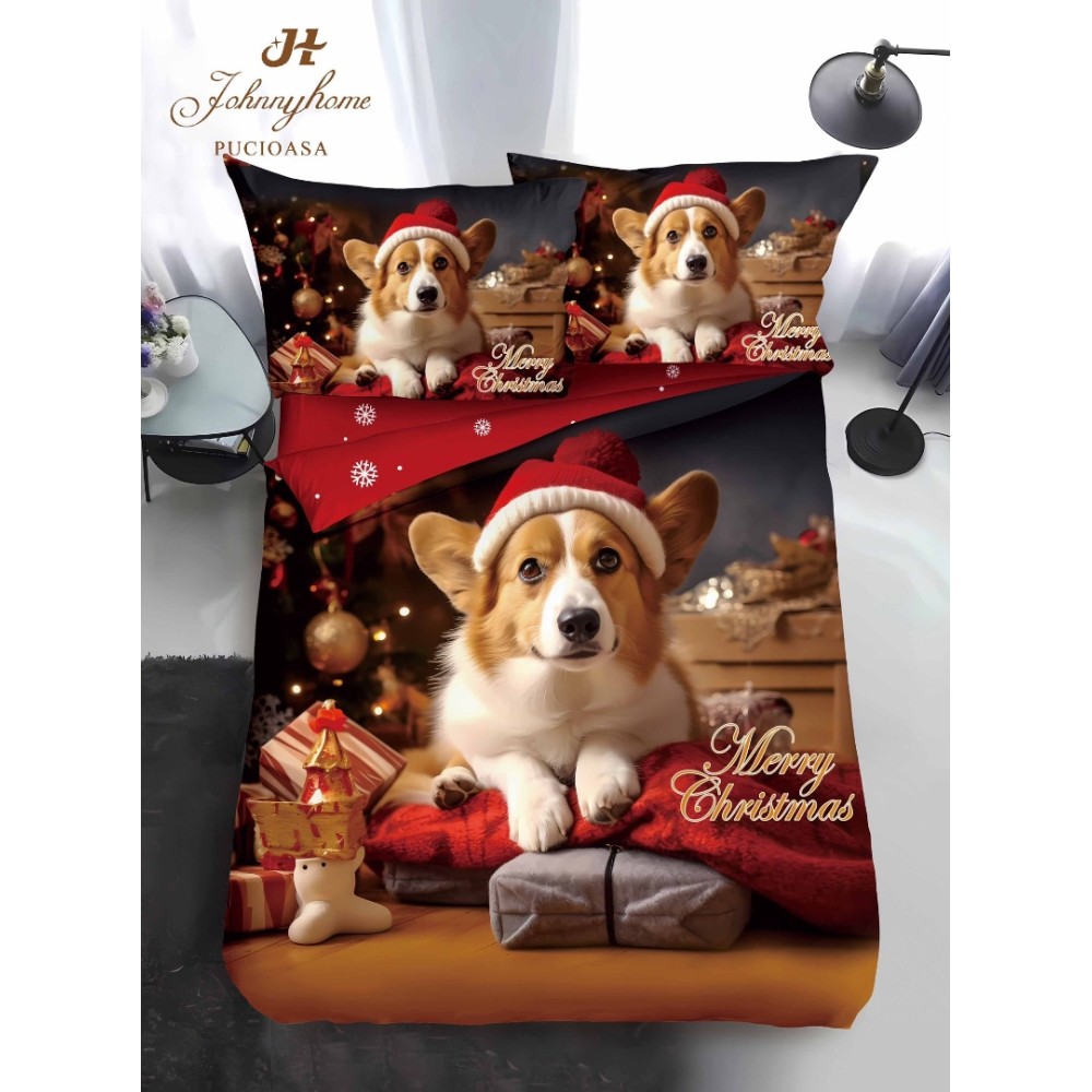 Lenjerie pat 1 PERSOANA, BUMBAC FINET, 4 piese, Identică cu Poza, Craciun, Roșu, Maro, cățel, Johny Home Pucioasa, cod produs: SPR-Qy-29