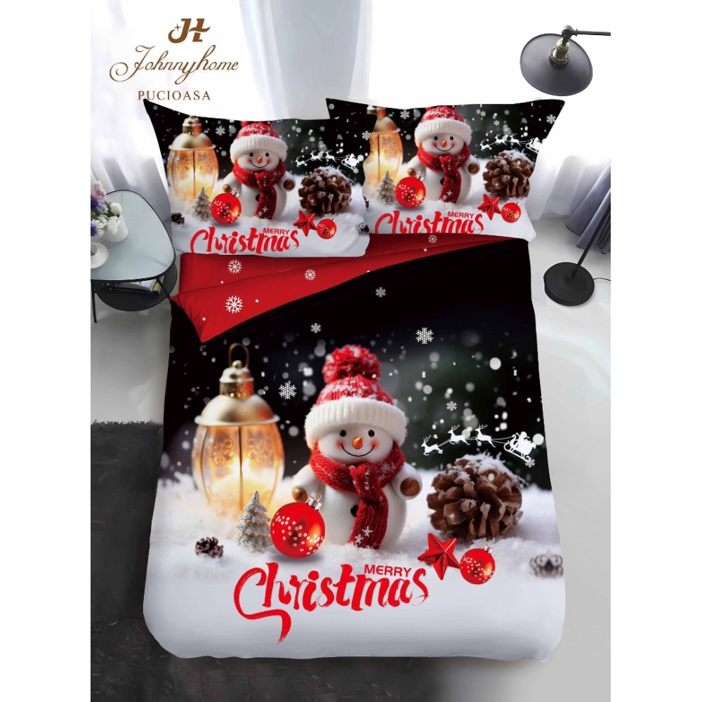 Lenjerie pat 1 PERSOANA, BUMBAC FINET, 4 piese, Identică cu Poza, Craciun, Roșu, Negru, om de zăpadă, fulgi de nea, Johny Home Pucioasa, cod produs: SPR-Qy-31