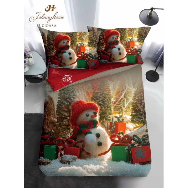 Lenjerie pat 1 PERSOANA, BUMBAC FINET, 4 piese, Identică cu Poza, Craciun, Verde, Roșu, om de zăpadă, cadouri, Johny Home Pucioasa, cod produs: SPR-Qy-38