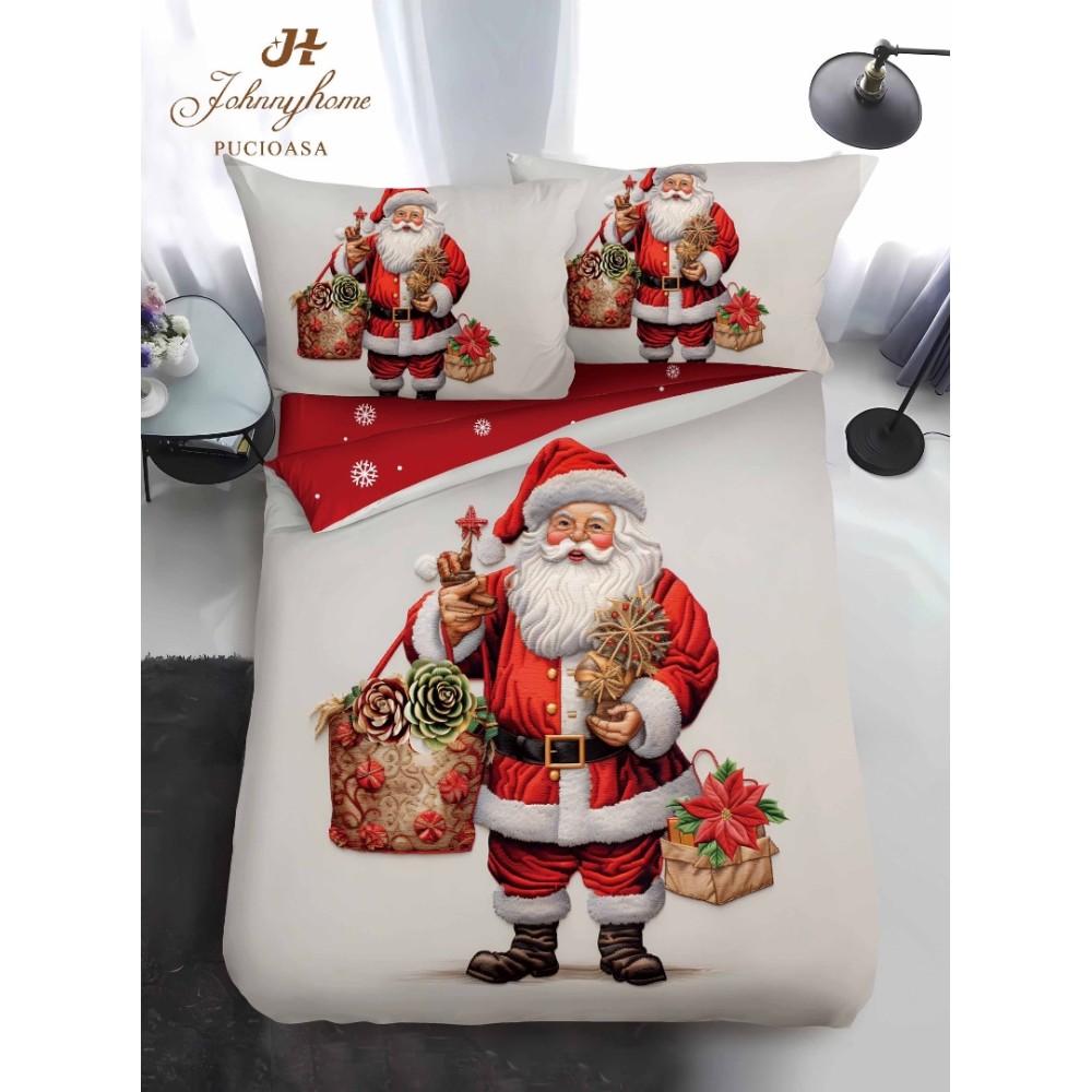 Lenjerie pat 1 PERSOANA, BUMBAC FINET, 4 piese, Identică cu Poza, Craciun, Gri, Roșu, Moș Crăciun, Johny Home Pucioasa, cod produs: SPR-Qy-40