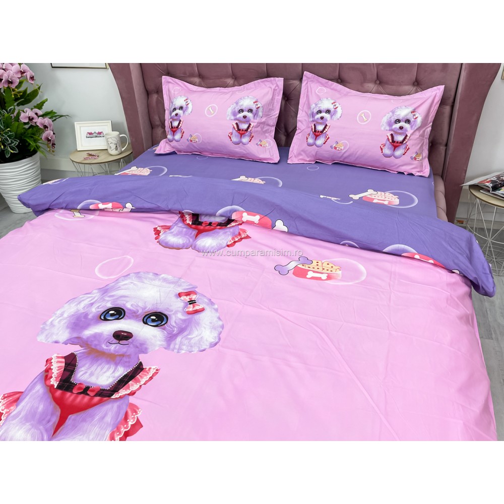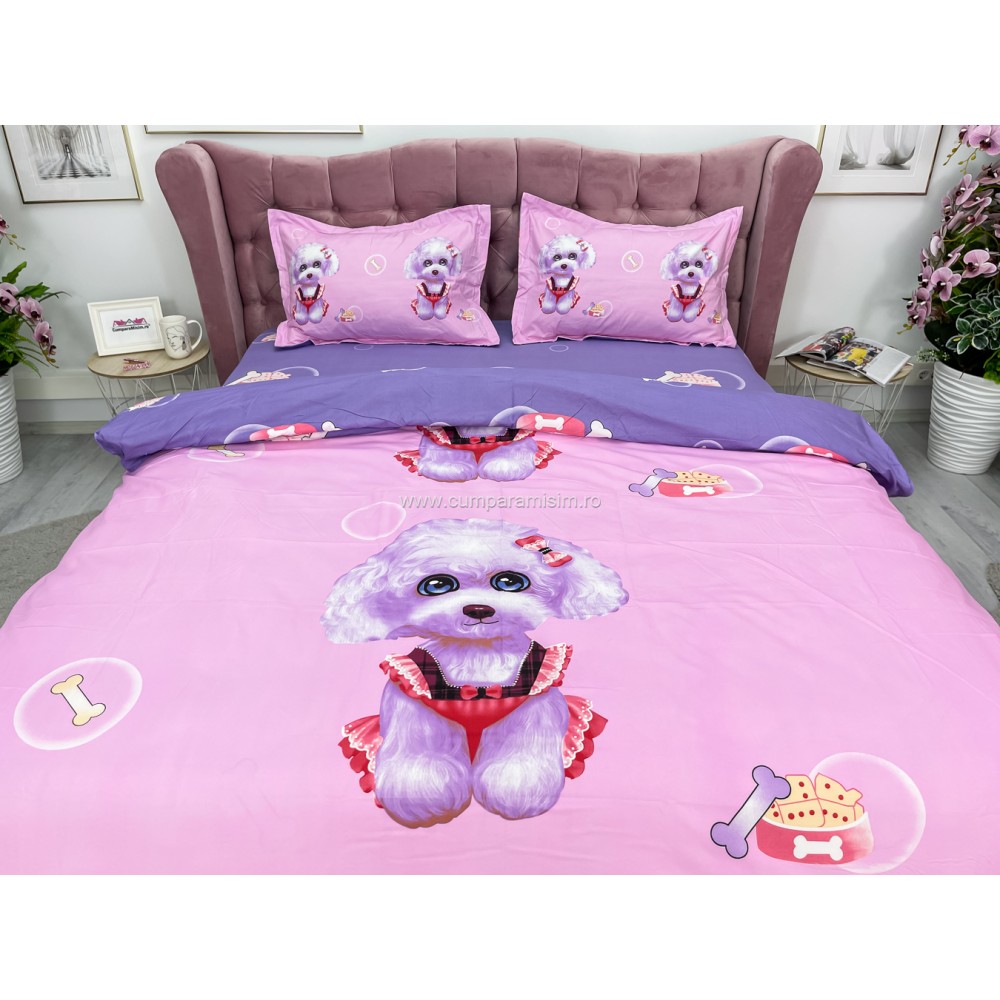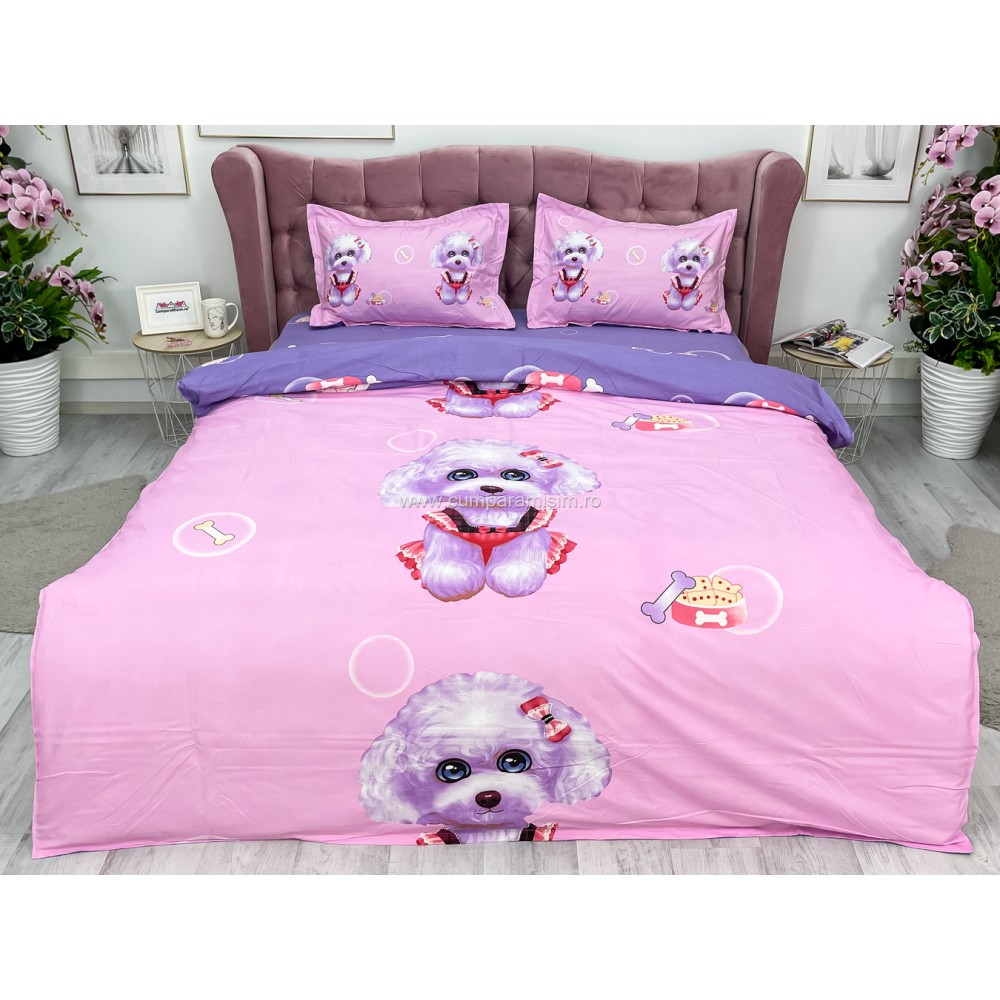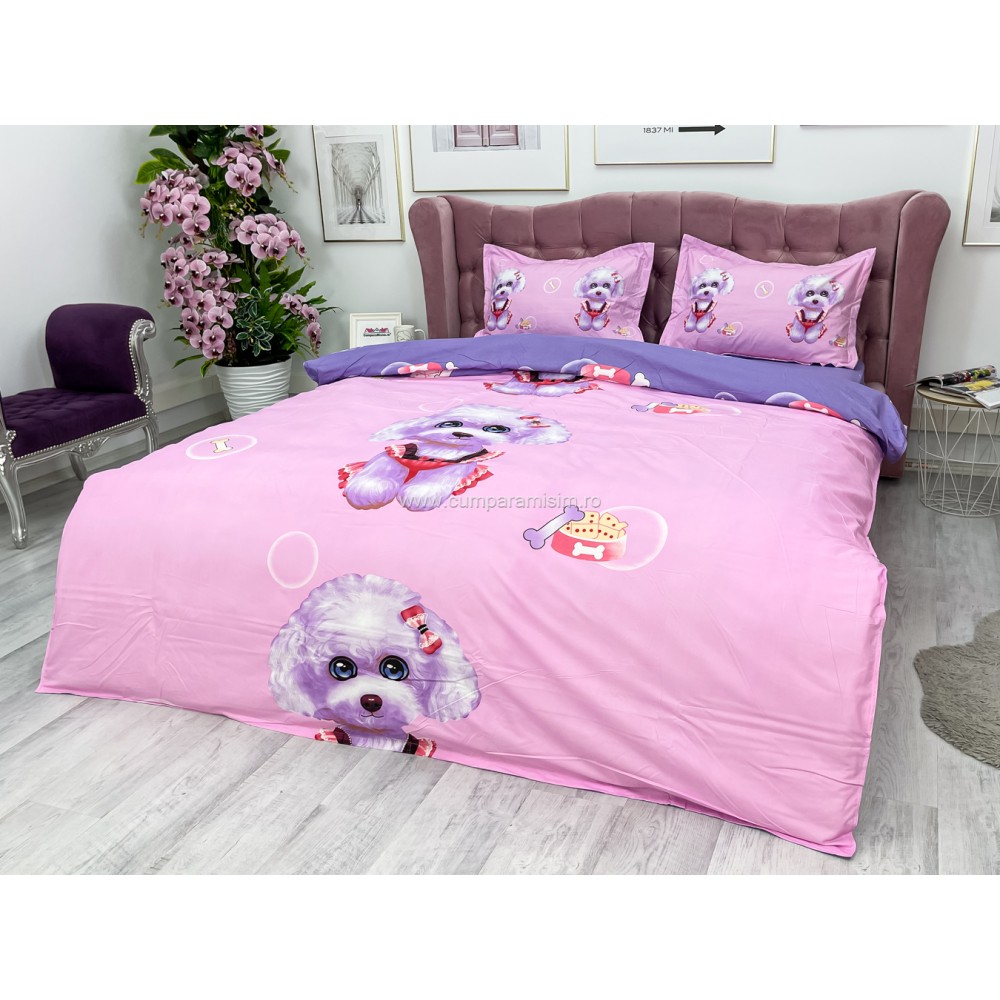 Lenjerie pat dublu, IMPRIMEU 3D DIGITAL, IDENTIC CU POZA, Roz, catelusi, Johny Home Pucioasa, cod produs: SPR-D-01