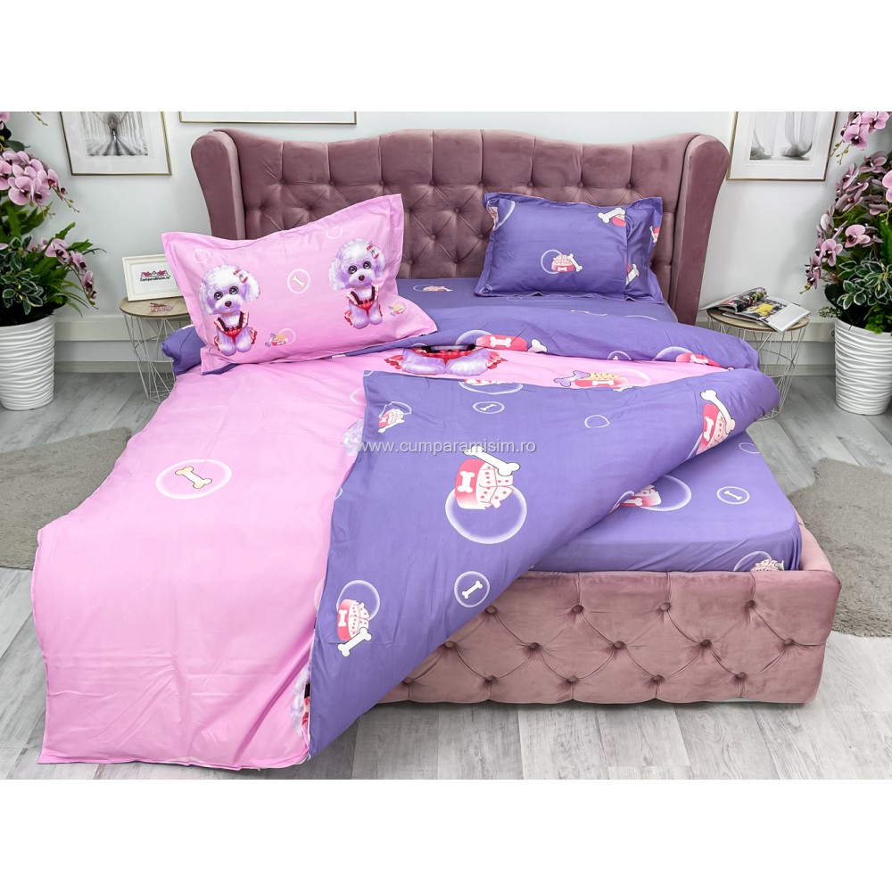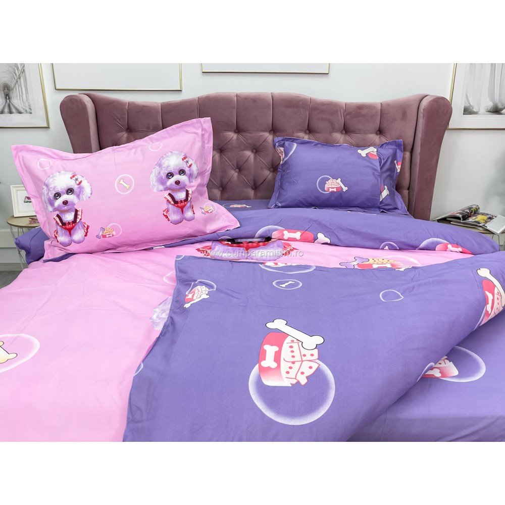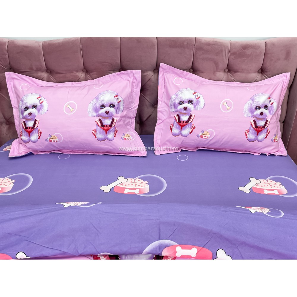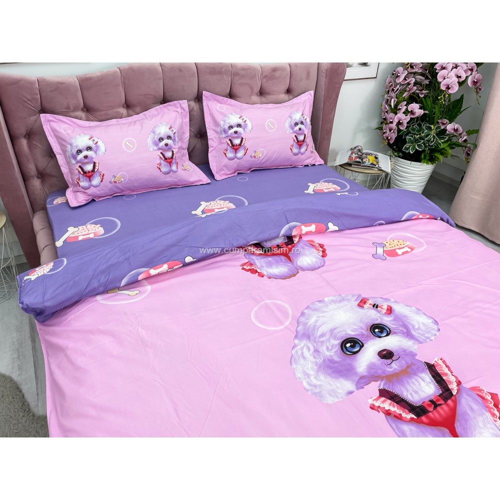 Lenjerie pat dublu, IMPRIMEU 3D DIGITAL, IDENTIC CU POZA, Roz, catelusi, Johny Home Pucioasa, cod produs: SPR-D-01